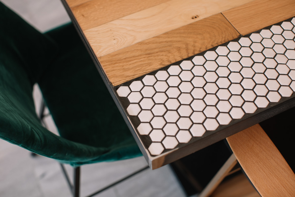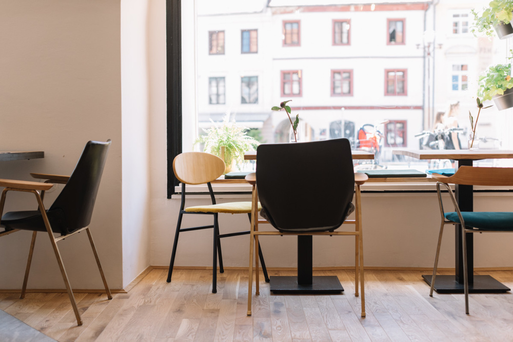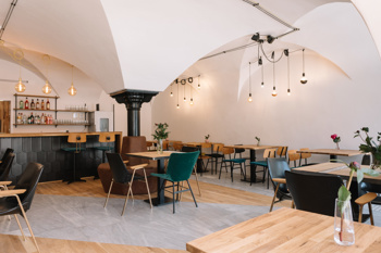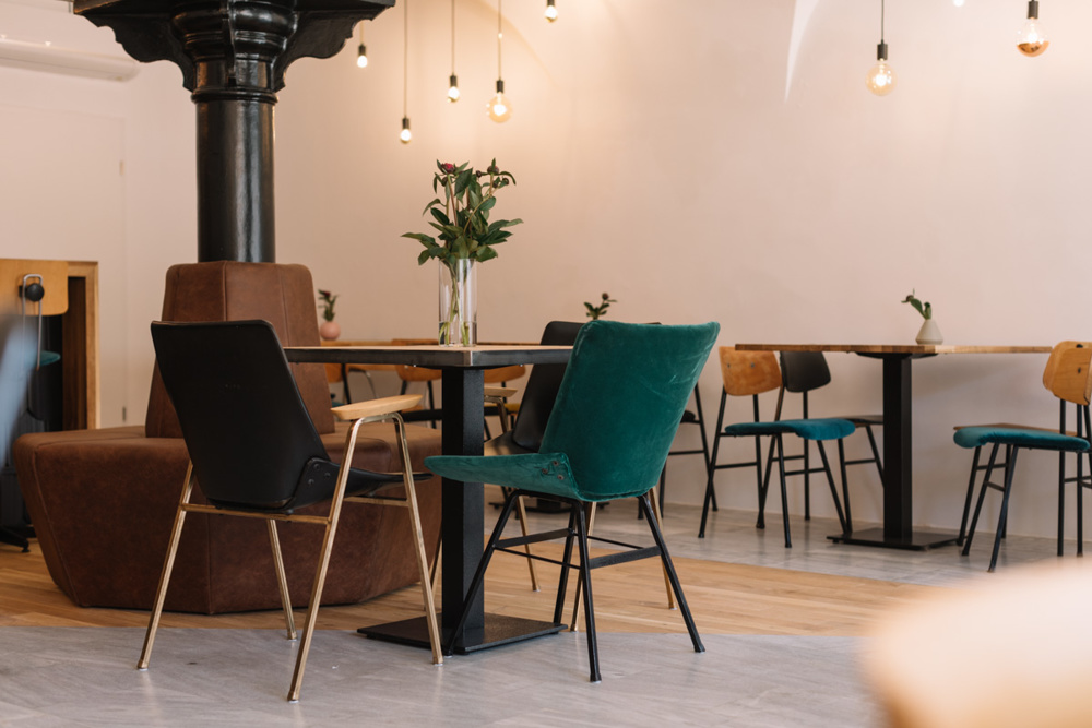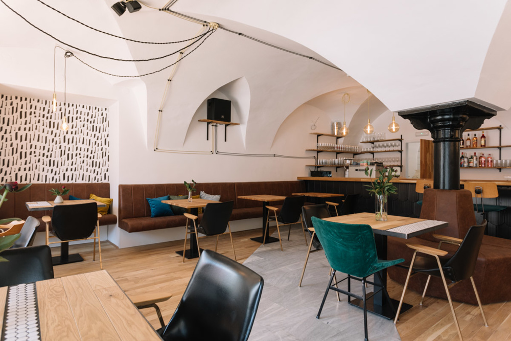 Stoli so retro - rabljeni, obnovljeni in ponovno v uporabi. Del stolov sta pustila v originalni obliki, to so stoli Nika Kralja, del stolov pa sta preoblekla v pisan žamet. Obdržala sta nekaj elementov prostora - del prvotnih talnih oblog (kamnit marmor), v katerega sta vkomponirala hrastov prket, ki je rdeča nit celotnega interierja. Prav tako so originalni vsi oboki in mogočen steber sredi lokala.