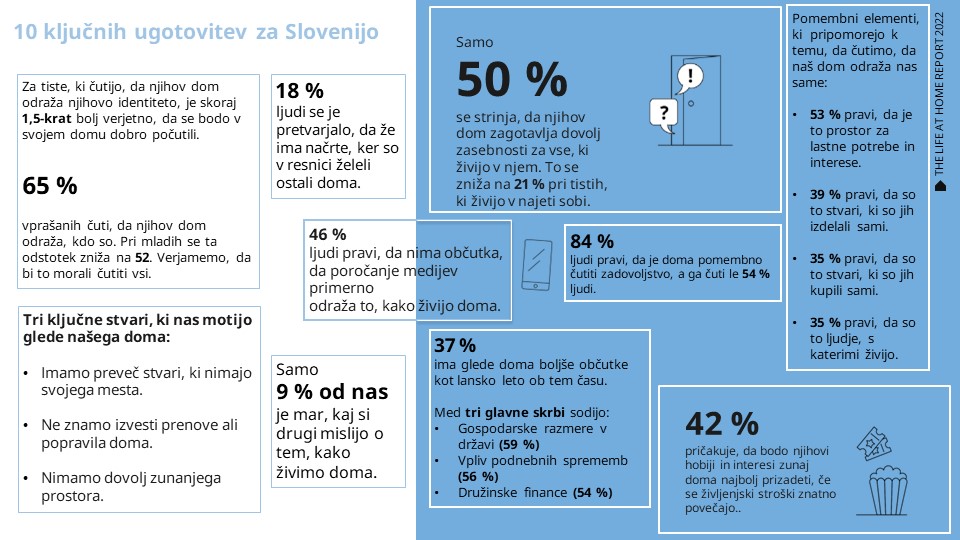 Raziskava je med drugim pokazala tudi, da 55 odstotkov vprašanih v Sloveniji meni, da njihov dom odraža njihovo osebnost. Med elementi, ki pripomorejo k temu, da je dom odraz njihove osebnosti, dobra polovica izpostavlja prostor za lastne potrebe in interese, 39 odstotkov jih izpostavi stvari, ki so jih naredili sami, za 35 odstotkov ljudi pa so to stvari, ki so jih kupili sami, in ljudje, s katerimi živijo.
