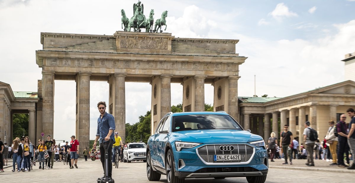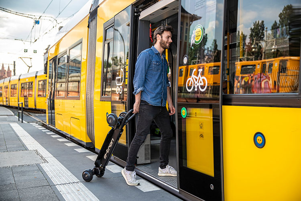 Skiro Audi e-tron Scooter združuje prednosti električnega skiroja in rolke in je zasnovan za športne duše. Če ga želite prevažati z avtomobilom, avtobusom ali vlakom, lahko 12-kilogramski e-skiro zložite in ga priročno shranite na zadnjem delu avtomobila ali pa ga za seboj vlečete kot voziček.