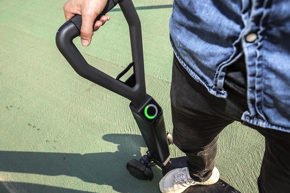 Krmilni ročaj daje stabilnost, hrani akumulator in elektroniko ter nosi zaslon, ki prikazuje stanje baterije. Voznik pospešuje in zavira z zasukom ročice. Doseg 20 kilometrov je mogoč z uporabo rekuperacije (ko e-skiro zavira se del kinetične energije povrne). Hidravlična nožna zavora zagotavlja dodatno varnost.