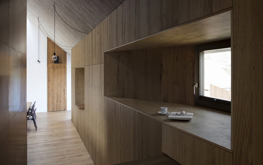 Že samo ime hiše pove, kje so arhitekti našli navdih, si pa morda na prvi pogled ne bi mislili, kako prijetna je njena notranjost. Pritlični in kletni prostori so videti kot eno, po sobah, ki zagotavljajo zasebnost in uporabnost, se lahko prosto in neprekinjeno gibljemo, obenem pa imamo občutek, da smo z vsemi prostori hkrati povezani. Morda zaradi kuhinje z večnamenskim štedilnikom na drva in v katero svetloba pronica skozi strešno okno, ki se linearno razprostira po grebenu strehe in tako vsem prostorom omogoča dnevno svetlobo.