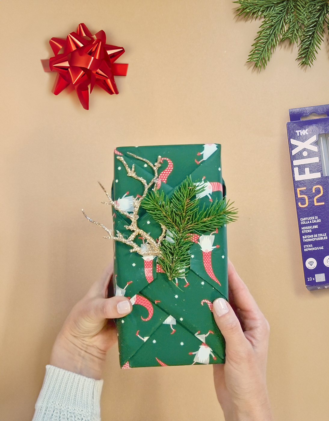 Se vam zasvetijo oči, ko dobite v dar umetelno zavit paketek? Tako privlačen, da ga je kar škoda odviti? Tudi vi lahko svoje najdražje presenetite z lično zavitim darilom, elegantno pozornostjo. Na spletu kar mrgoli različnih idej za unikatno zavijanje daril. Mogoče izgledajo komplicirane, vendar vas navodila za zavijanje v obliki kratkih videov enostavno vodijo skozi proces ustvarjanja. Preizkusite se v tehniki zavijanja daril kot profesionalec! Darilni papir med zavijanjem darila fiksirajte s pištolo za vroče lepljenje. Za dodatek čarobnosti na darilni paketek zalepite še nekaj okrasnih vejic in božični okrasek.