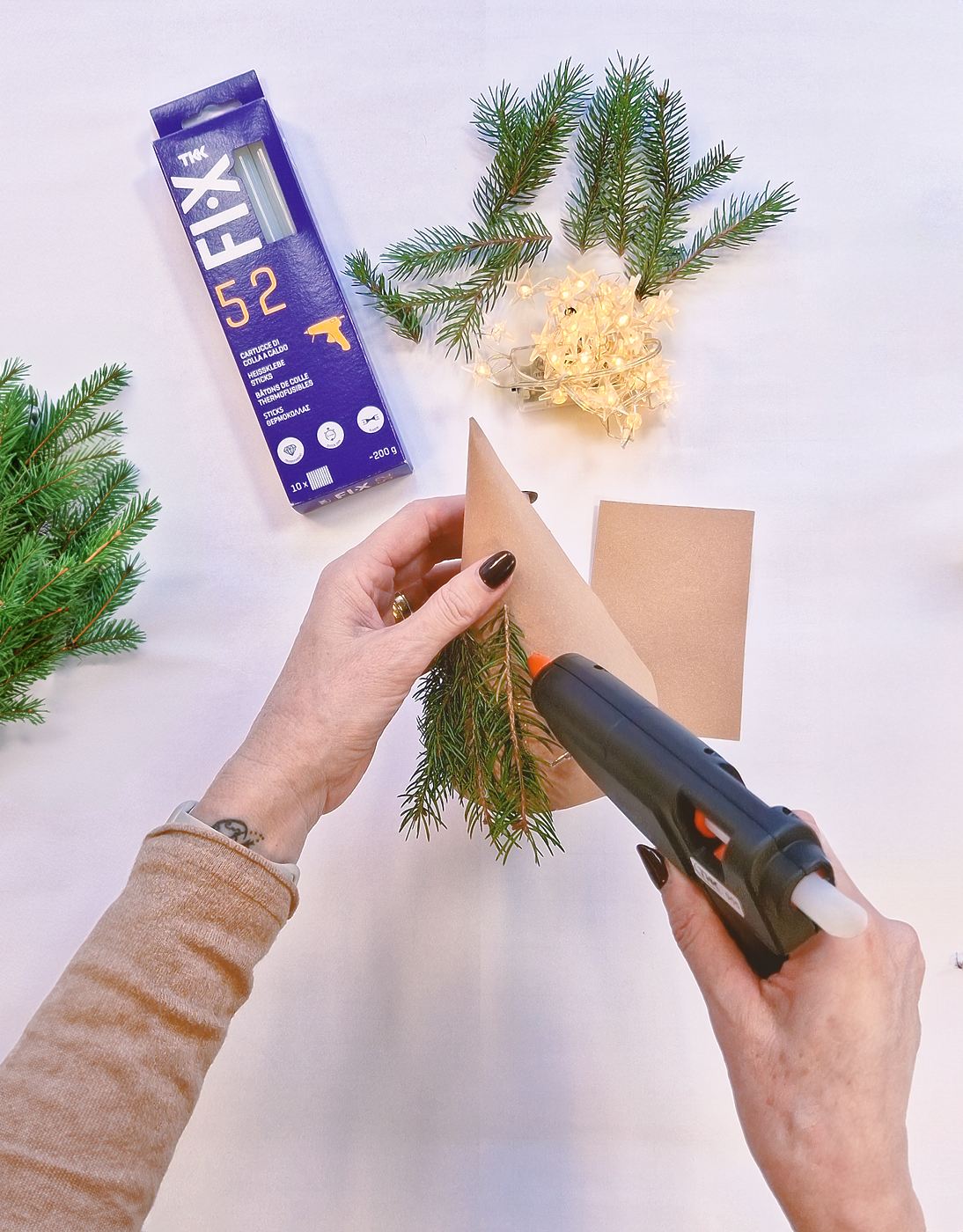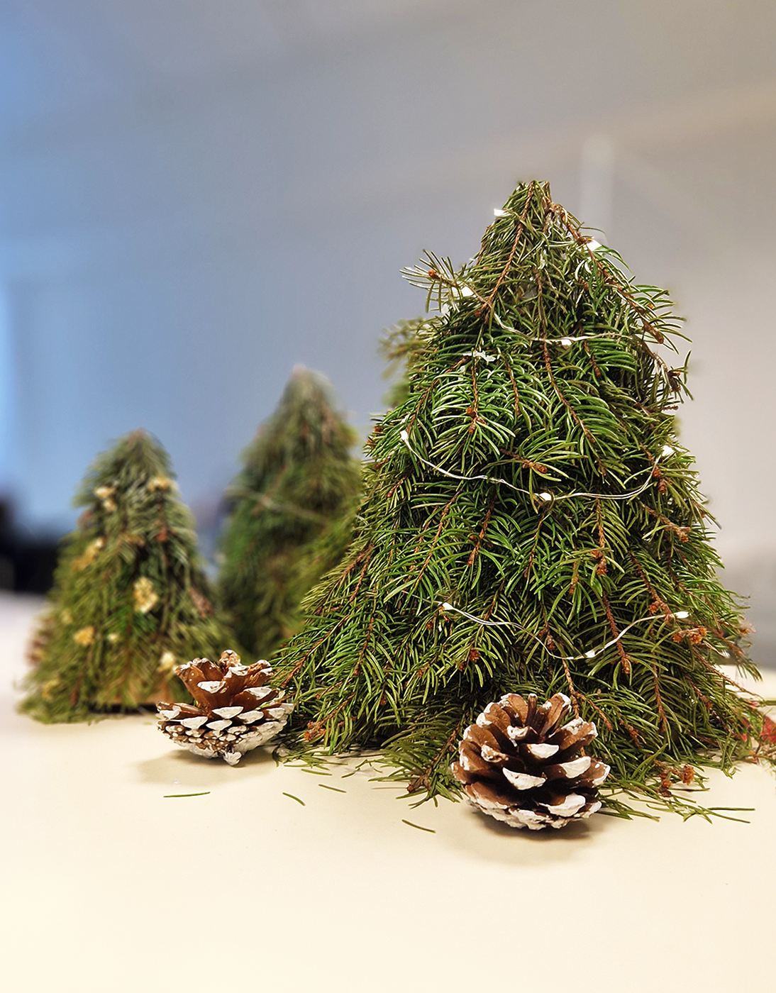 Božično drevesce, ki spominja na smreko v idiličnem gozdu? Z malo truda ga lahko ustvarite tudi vi! Potrebujete le šop manjših vejic smrečja, recikliran karton, male LED lučke in pištolo za vroče lepljenje. Iz kartona naredite stožec, na katerega s pištolo za vroče lepljenje pritrdite smrekove vejice. Na koncu smrečico samo še okrasite s svetlečimi lučkami.