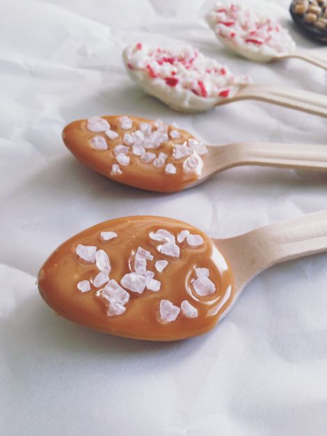 Kako se torej lotiti izdelave? Izbran okus raztopimo. To lahko storimo v mikrovalovni ali s topljenjem nad paro. Tekoči obliki izbranega okusa ne dodajajmo dodatnih tekočin, saj se zmes ne bo popolnoma strdila. Ko sta čokolada in karamela raztopljeni, vanju namočimo žlico jo posujemo z dodatki. Odložimo in počakamo da se vsebina žlice ohladi in strdi. Za lepši izgled lahko žlice zavijemo v celofan in jih okrasimo z okrasnimi trakovi.