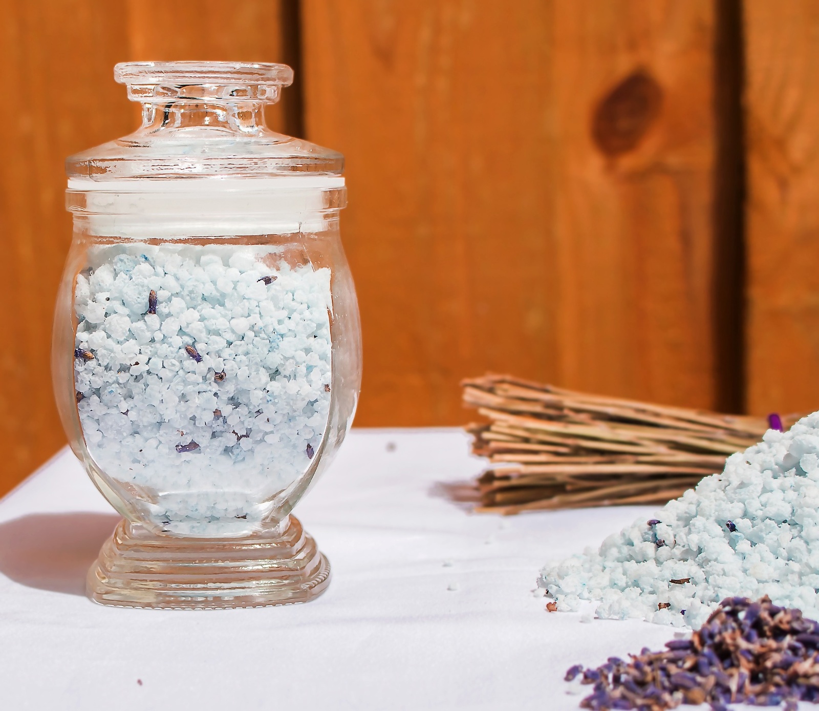 Za pripravo domače kopalne soli potrebujemo morsko in grenko sol (Epsom sol), kozarčke s pokrovom, eterična olja in barvila s katerimi obarvamo hrano.