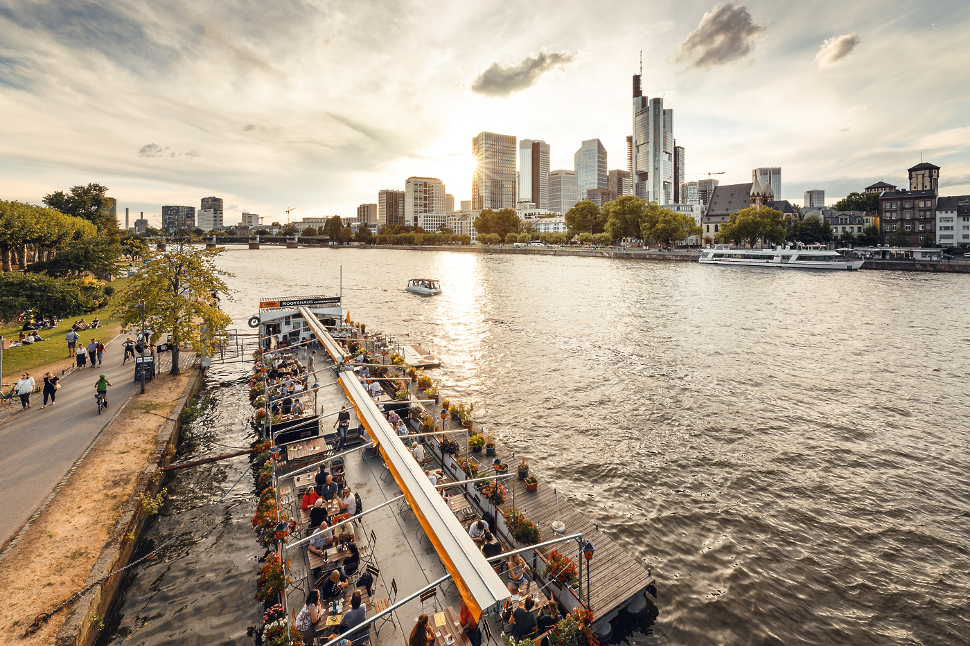 Frankfurt na Majni: sprehajališče ob rečnem bregu in pogled na restavracijo na reki Majni. © DZT / Felix Meyer