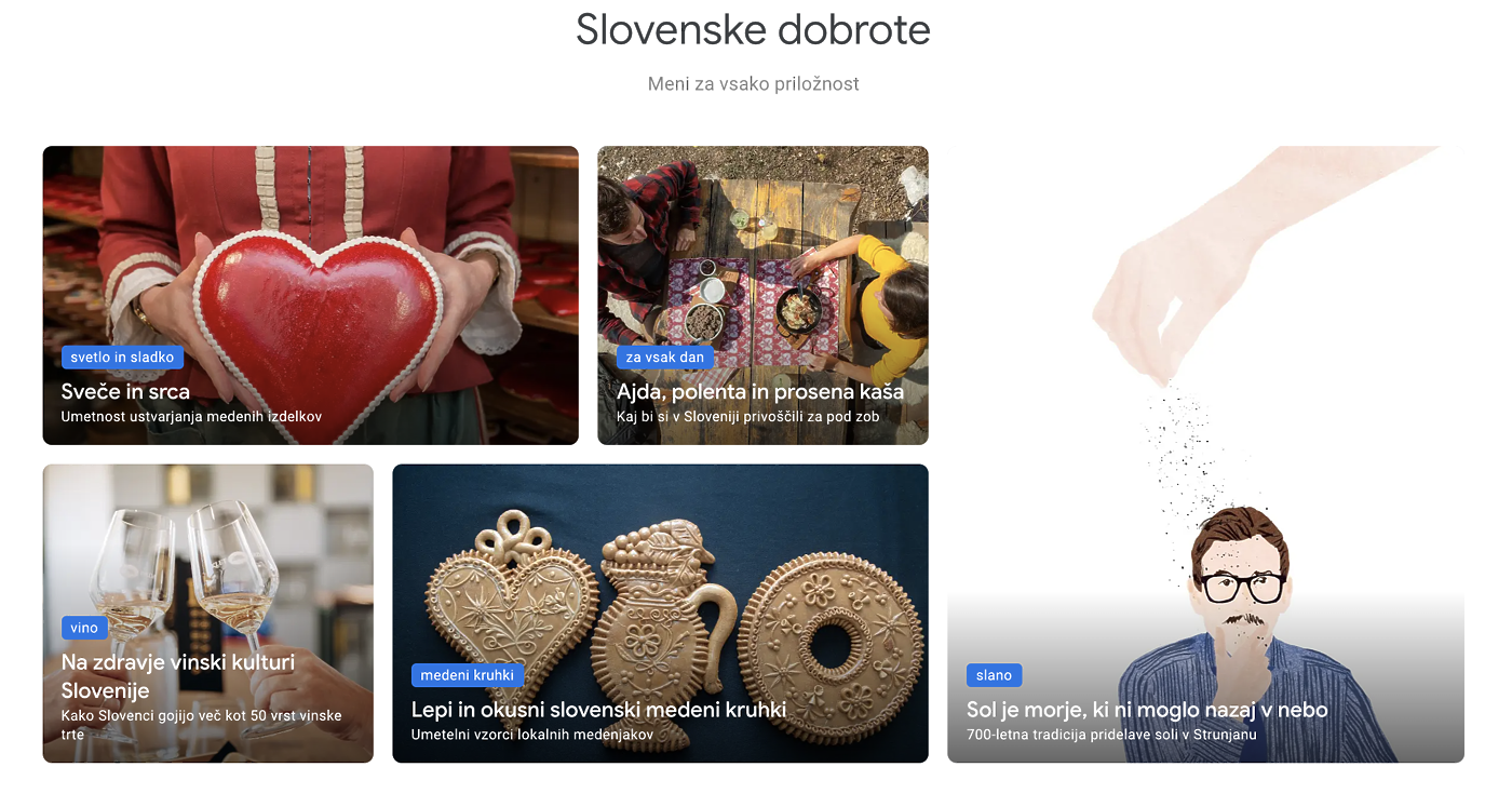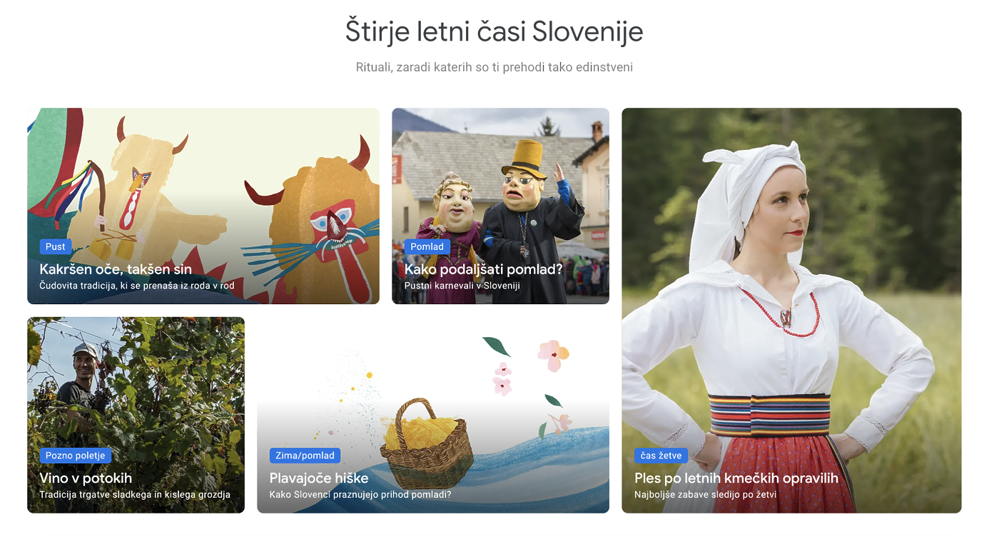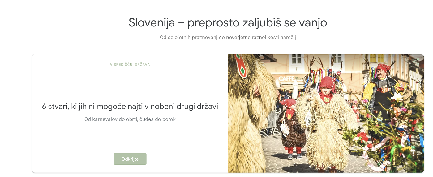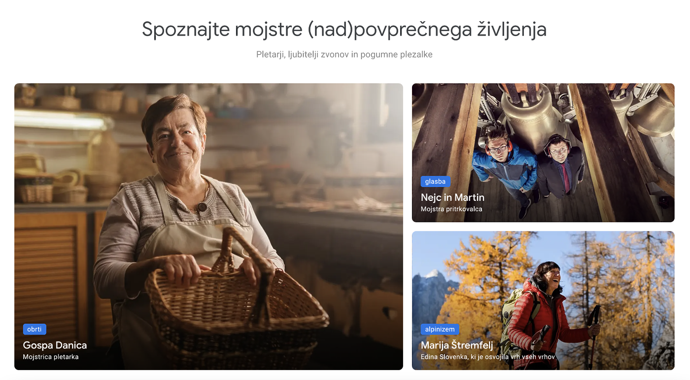 Kot plod sodelovanja med Google Arts & Culture in Slovensko turistično organizacijo je na spletni strani g.co/travelslovenia zdaj na voljo spletni vpogled v bogato slovensko naravno in kulturno dediščino, in sicer v slovenskem ter angleškem jeziku. Edinstvene obrti, dih jemajoči razgledi in predani ljudje so predstavljeni tudi v kratkem filmu.
