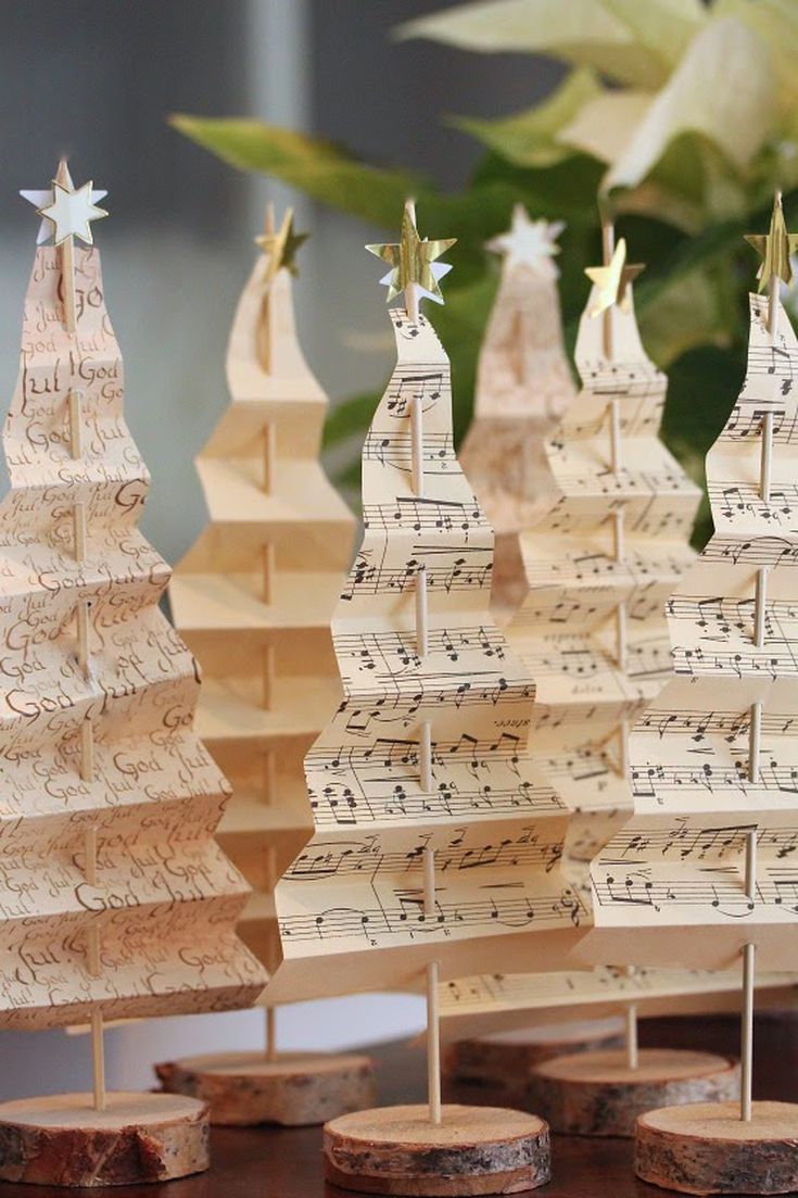 Za izdelavo potrebujemo note, majhen okrogel kos lesa in dolge zobotrebce. Note razrežemo v trikotnike jih zložimo v harmoniko, skozi celotno dolžino potisnemo zobotrebec in ga zapičimo v les. Tako dobimo prava glasbena božična drevesca, ki bodo polepšala še tako dolgočasno mizo.
