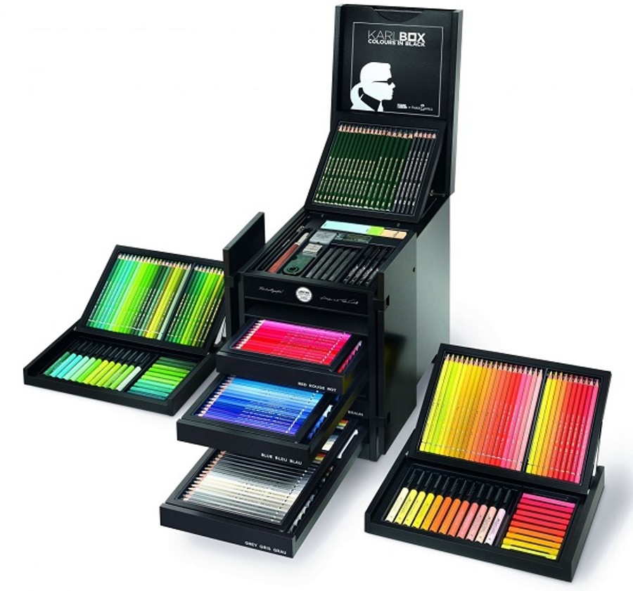 Karl Lagerfeld se je lotil novega oblikovalskega podviga, saj je za Faber-Castell oblikoval luksuzni set barvic. Vrtoglava cena, 2.850 dolarjev, za zaboj barvic se zdi visoka, a ko pomislimo, da se oblačila s podpisom Chanel prodajajo tudi za 100.000 dolarjev, se zaboj barvic zdi solidna kupčija.