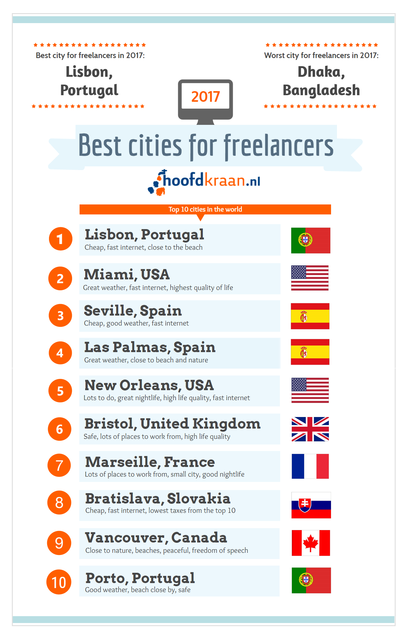 V zadnji študiji, ko jo je pripravila nizozemska platforma Hoofdkraan.nl so Lizbona, Miami in Sevilja tri najboljša mesta za 'freelancerje'. Lizbona je celo na prvem mestu, v celoti pa prevladujeta Evropa in Severna Amerika.