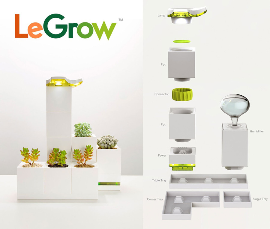 Podobno kot LEGO kocke ima vsak element v LeGrow sistemu svoj namen pri spodbujanju rasti in ohranjanju zdrave rastline. Vsak lonček je, denimo, opremljen z notranjih rezervoarjem z vodo, kar pripomore k nadzoru nad količino vode, medtem ko imajo LED lučke vlogo pri spodbujanju rasti tudi v prostorih brez oken, v prostorih s šibko svetlobo ali v zimski sezoni, ko je dan kratek. Tu sta še vlažilnik, ki deluje kot megla v naravnem okolju in rastline oskrbuje z vlago, lonček 'z močjo' pa je oblikovan kot običajni lonček, le da ima štiri nepremočljive USB vtičnike, preko katerih se lahko povežemo tudi s pametnim telefonom, ki nam pokaže, kako trenutno deluje naš mali vrtni sistem.