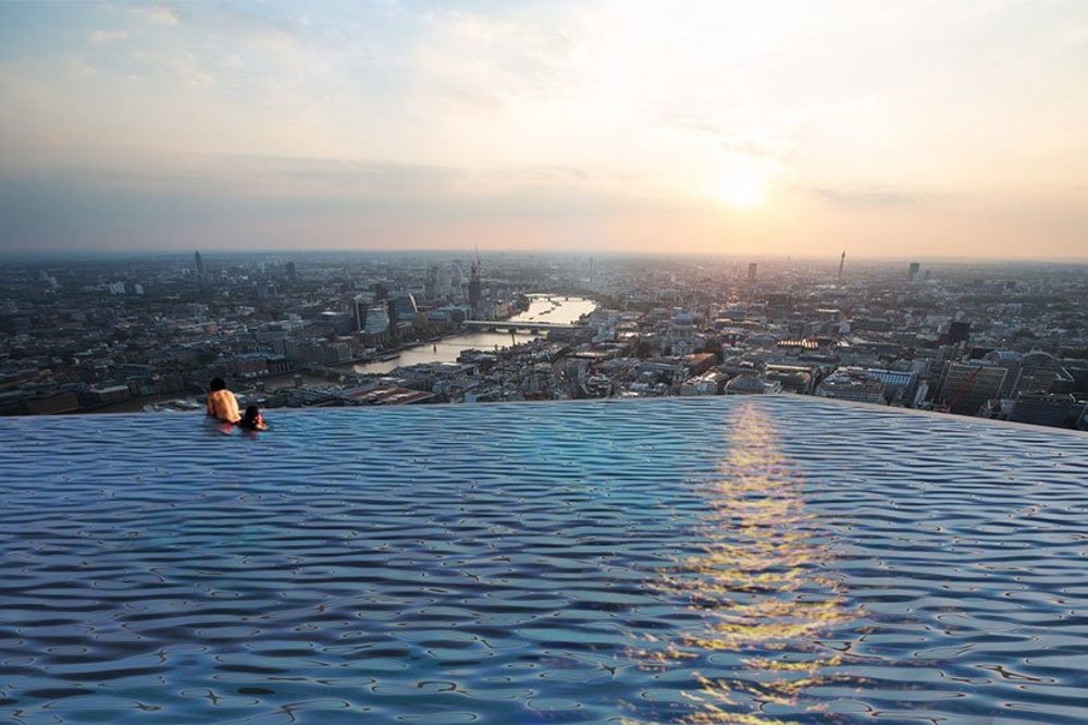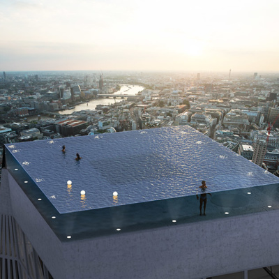 V Londonu načrtujejo gradnjo prvega 360-stopinjskega neskočnega bazena na svetu. Britanski izdelovalec bazenov Compass Pools, je predstavil svoje načrte za 600.000 litrski bazen, ki bo stal na vrhu 55. nadstropnega hotela in obiskovalcem omogočil, da se kopajo več kot 200 metrov nad mestnim obzorjem.