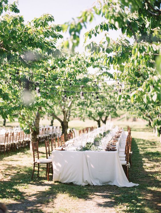Organizirajte poročni banket sredi vinograda, kjer lahko vsi gosti sedijo za eno dolgo mizo.