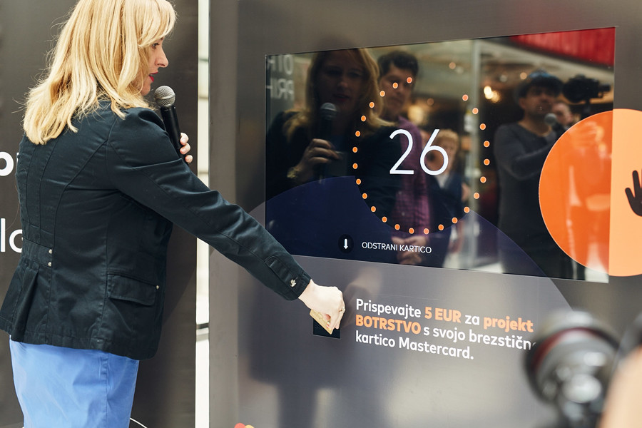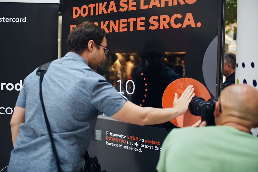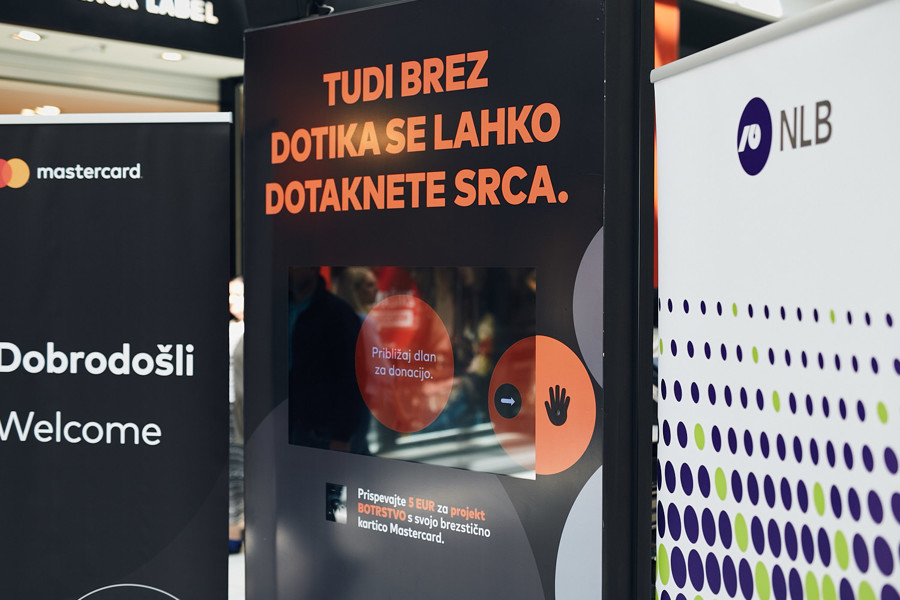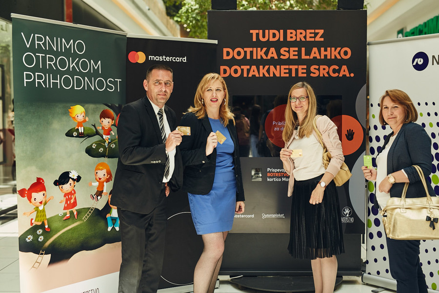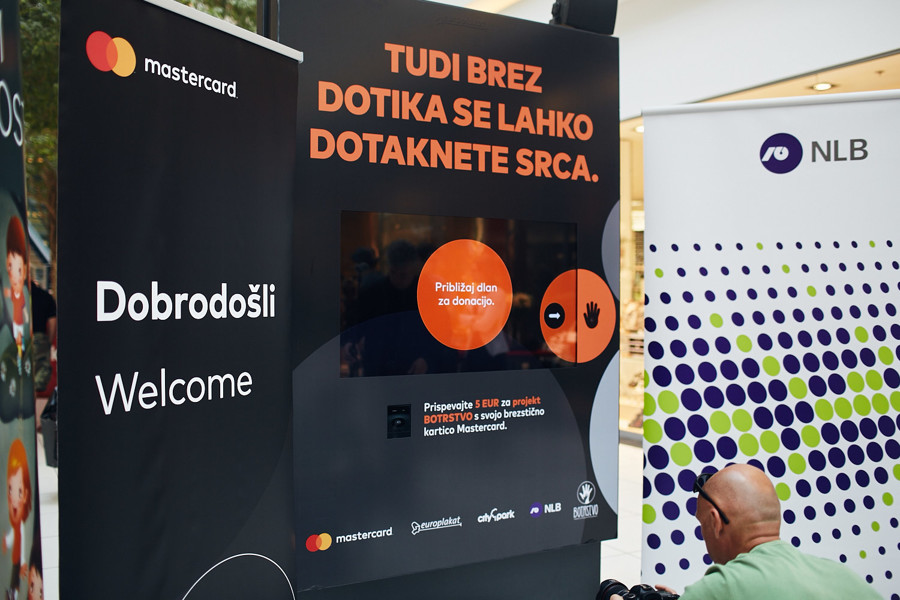 Družba Mastercard v Sloveniji s partnerji NLB, družbo Europlakat in nakupovalnim središčem Citypark pričenja z akcijo "Tudi brez dotika se lahko dotakneta srca". S pomočjo inovativne tehnologije, prvič v Sloveniji vgrajene v svetlobne vitrine Citylight, nas želijo spodbuditi k njihovi aktivni udeležbi pri zbiranju sredstev za projekt Botrstvo v Sloveniji. Tako bomo lahko vse do konca letošnjega šolskega leta v vseh večjih nakupovalnih centrih v Ljubljani, Mariboru in Celju prek brezstičnega plačevanja s karticami Maestro in Mastercard namenili pet evrov za otroke iz socialno ogroženih družin iz vse Slovenije.