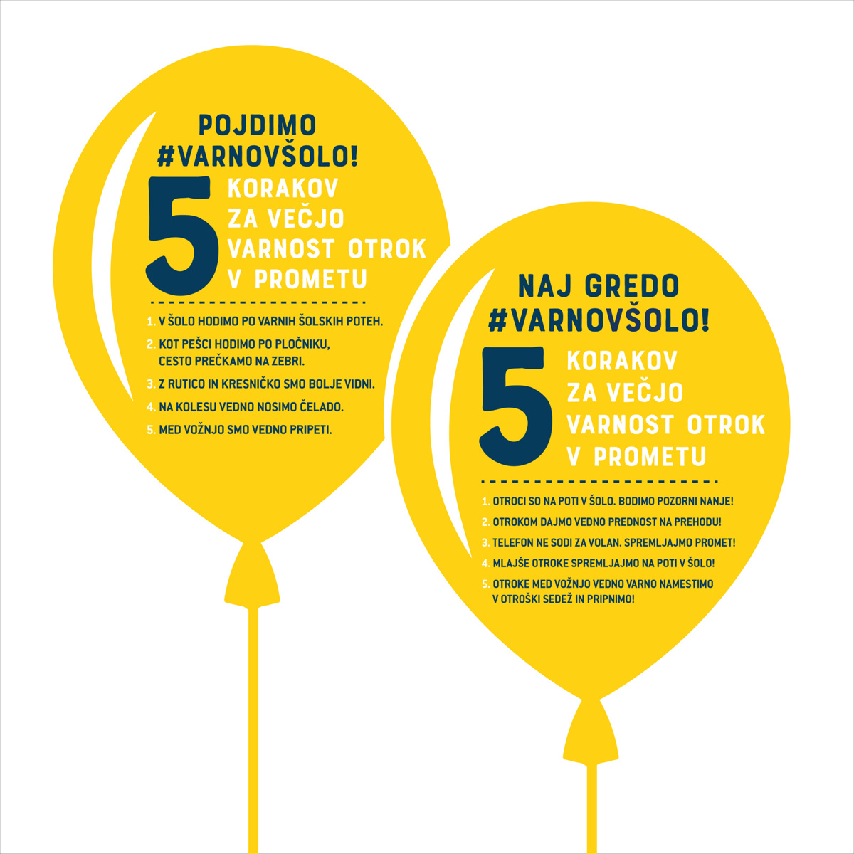 Agencija za varnost prometa želi poskrbeti za še boljšo vidnost otrok na cesti in njihovo večjo varnost, zato je za letošnji prvi šolski dan poskrbela za prav posebno akcijo s sloganom #VarnoVŠolo, katere osrednji simbol sorumeni baloni, ki bodo voznike opozarjali na prisotnost otrok na cesti. Vsi prvošolčki v Sloveniji, letos jih bo prag šole prvič prestopilo 20.840, bodo skupaj s preventivnimi gradivi na temo prometne varnosti prejeli tudi rumene biorazgradljive balone, s katerimi bodo še bolj vidni.