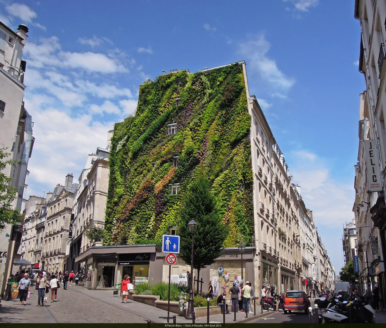 Podoben zakon o strešnih vrtovih, da morajo strehe krasiti zelenje ali solarne celice, je lani sprejel tudi Pariz, a zaenkrat učinka še ni videti. Je pa namesto streh zelena marsikatera fasada, predvsem po zaslugi Patricka Blanca, doktorja tropske botanike, ki ustvarja prave umetnine. Njegovi urbani vrtovi krasijo pariška pročelja na številnih lokacijah, po svetu pa jih je več sto. Leta uspevajo brez zemlje, saj so posajeni na posebno vrsto klobučevine in imajo vgrajeno črpalko za namakanje. Za zalivanje se uporablja deževnica, zbrana s streh. Vrtovi imajo poleg estetskih tudi zelo praktične lastnosti – učinkovito prispevajo k zniževanju porabe energije. V zimskem času namreč ščitijo stavbe pred mrazom, poleti pa služijo kot naravni hladilni sistem. Vertikalni vrt je tudi učinkovit način čiščenja zraka.