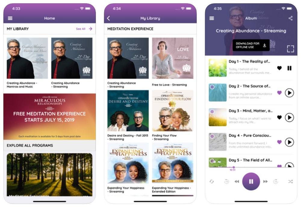 Oprah Winfrey, Deepak Chopra in Chopra Center Meditation predstavljajo izkušnjo 21-dnevne meditacije v obliki mobilne aplikacije. Na voljo so meditacije za zmanjšanje občutka tesnobe in stresna, za boljše spanje, za več ustvarjalnosti, miru in sreče, več odpornosti, vitalnosti in splošno dobrega počutja.