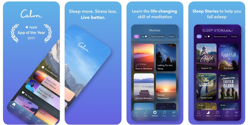 Aplikacija Calm vsebuje meditacijske zgodbe, ki nam bodo pomagale pri pomirjanju, meditaciji in tudi uspavanju. Če si želimo manj stresa, manj tesnobe in se zbuditi bolj spočiti, si pomagajmo z vodenimi meditacijami, zgodbami o spanju, dihalnimi programi, in sproščujočo glasbo. To aplikacijo priporočajo tudi strokovnjaki - psihologi, terapevti in strokovnjaki za duševno zdravje.