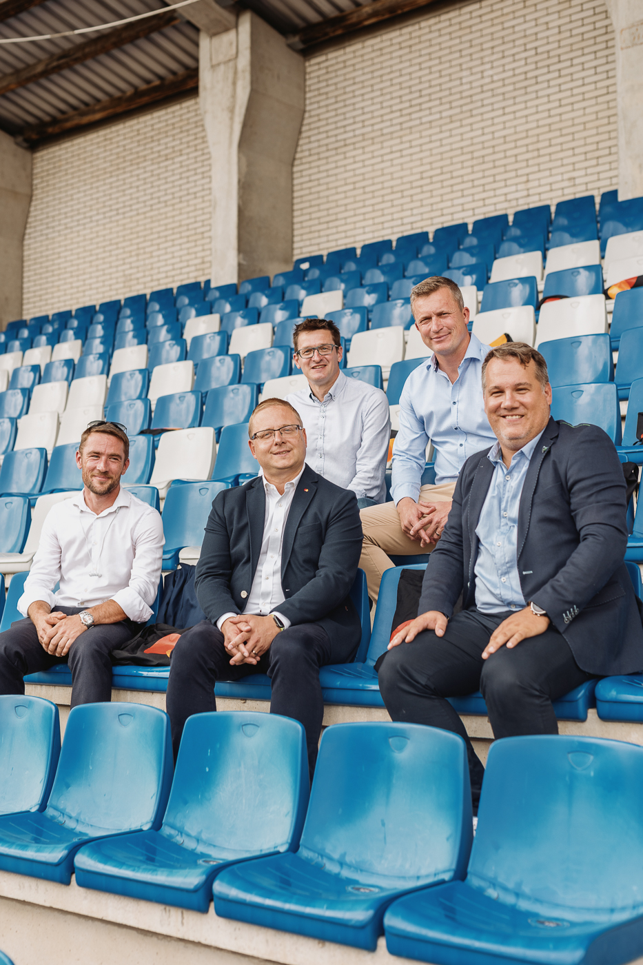 Na fotografiji (iz leve proti desni) Matjaž Polanič, poslovni direktor NK Bravo, Aleš Petejan, vodja marketinga, Mastercard Slovenija, športni voditelj Saša Jerkovič, Rok Plankelj, direktor RK Celje in Matjaž Možina, direktor družbe 2Mobile.