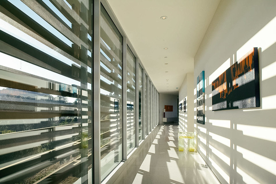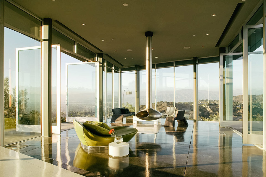 Osrednji bivalni prostor prepušča veliko dnevne svetlobe, saj je popolnoma obdan s steklom, vključuje minimalističen kamin, ki se razteza iz stropa in polirana betonskima tla, vse skupaj pa krasi pa tudi čudoviti razgled, ki je viden tudi iz bazena. Najboljši del celotne zasnove pa predstavlja zunanji zid, ki se lahko ob večerih spremeni v zaslon, viden tako iz dovoza kot iz območja nad garažo, ki je oblikovan posebej za ogled filmov.