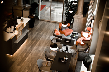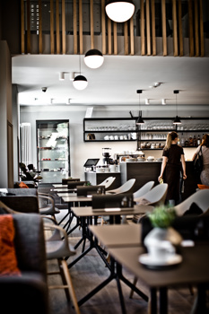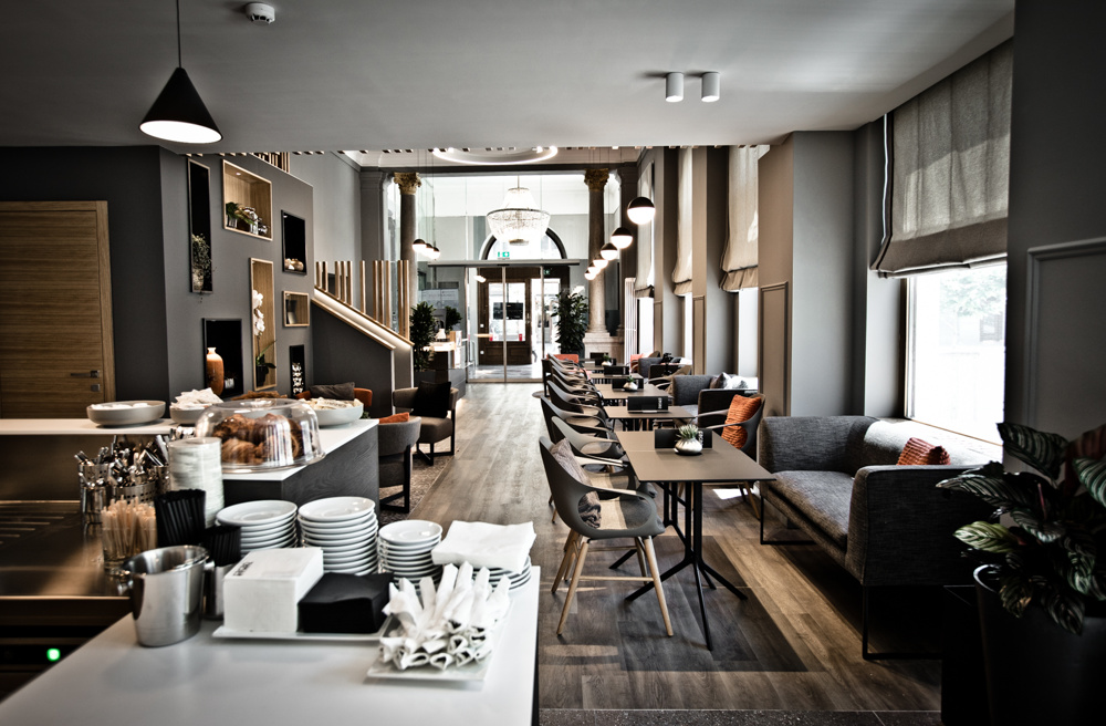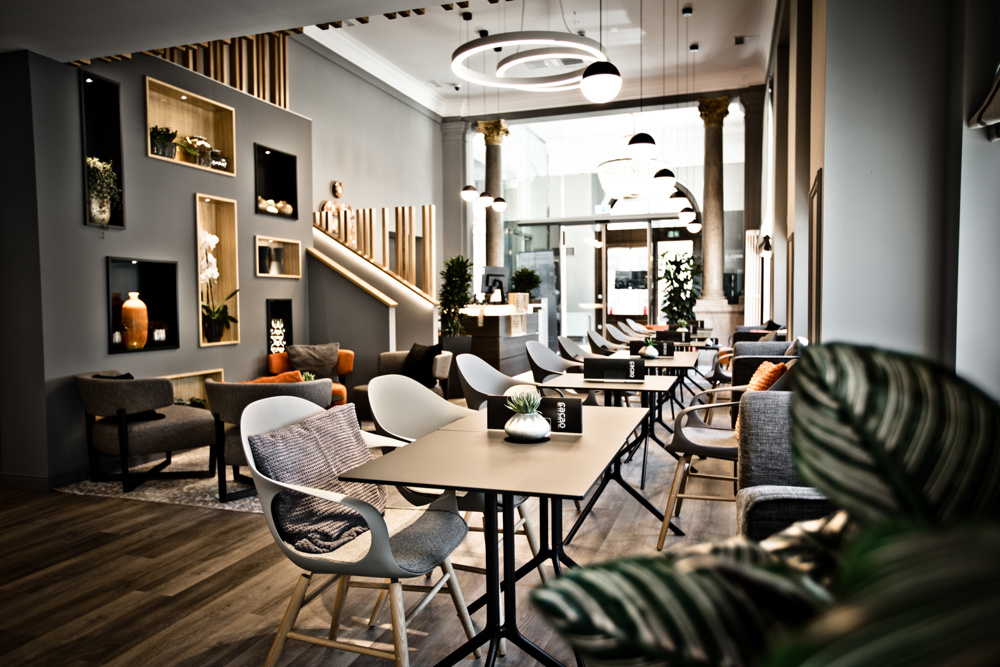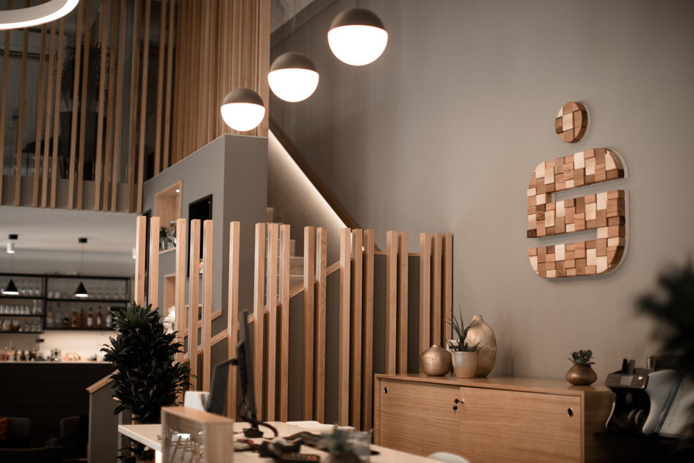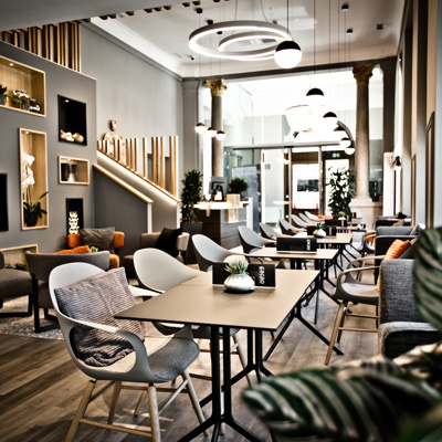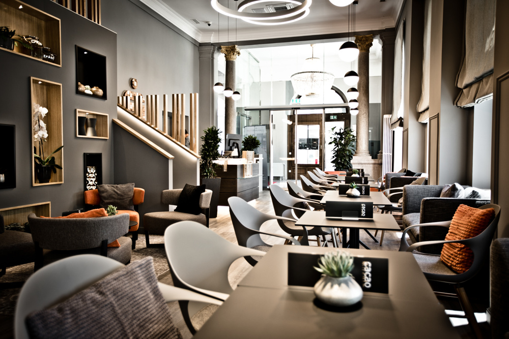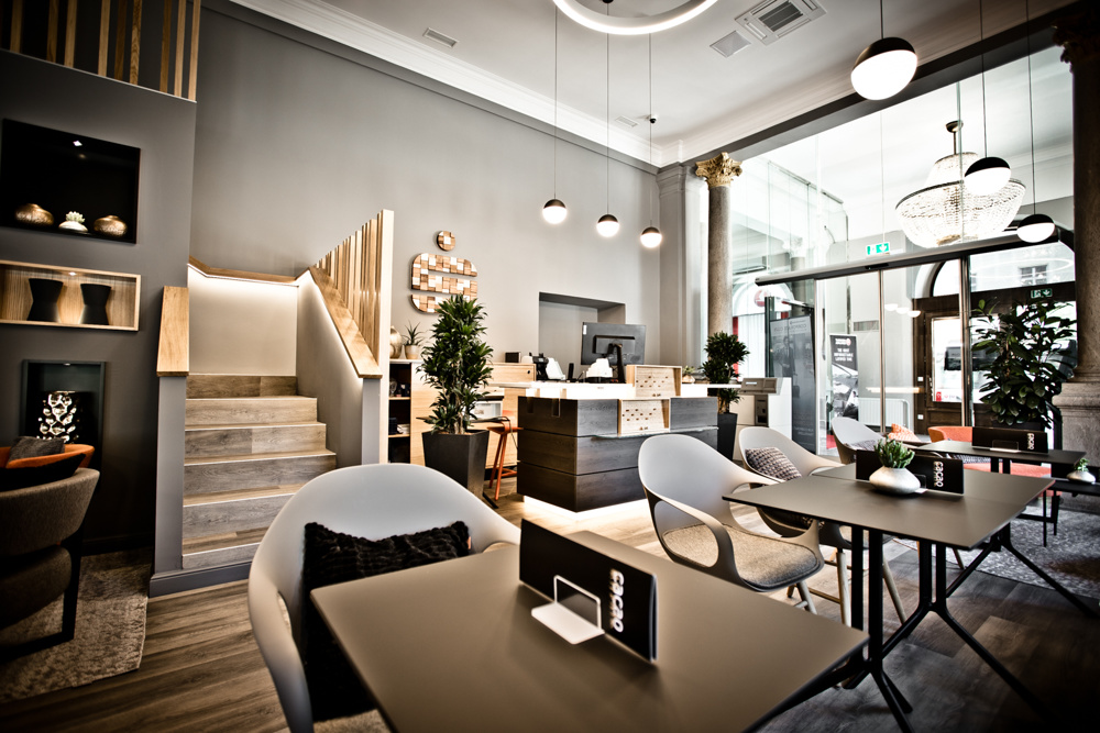 Prenovljena kavarna Evropa je kombinacija nežnih lesenih detajlov in enostavnih linij pušča prostoru, da diha. Sončna svetloba obliva prostor skozi velika okna, skozi katera je tudi danes mogoče opazovati mestni vrvež kot nekdaj. Banka Sparkasse in kavarna Cacao sobivata v popolni simbiozi. Eno od sten prenovljenega prostora krasi tudi velik lesen logotip banke Sparkasse, sestavljen iz kock iz štirih vrst lesa.