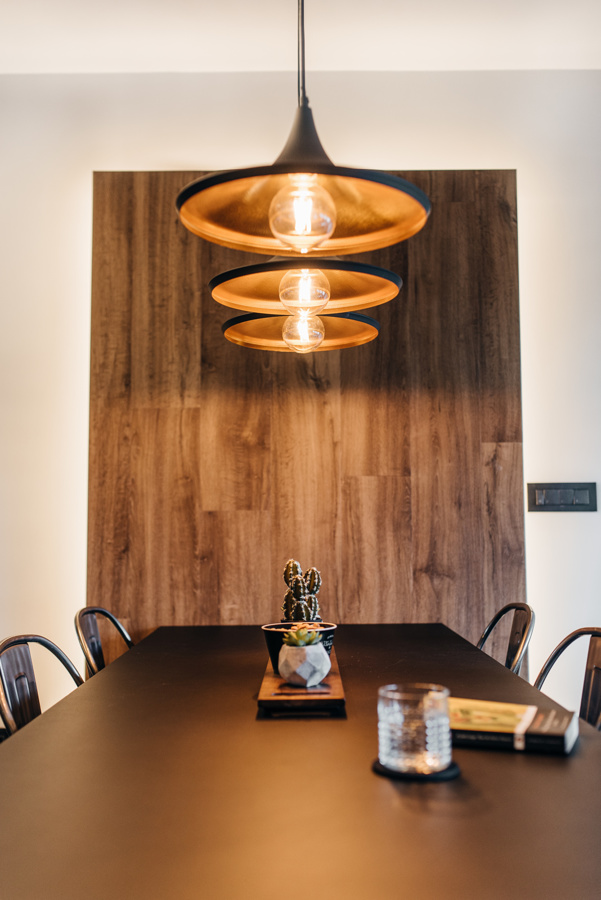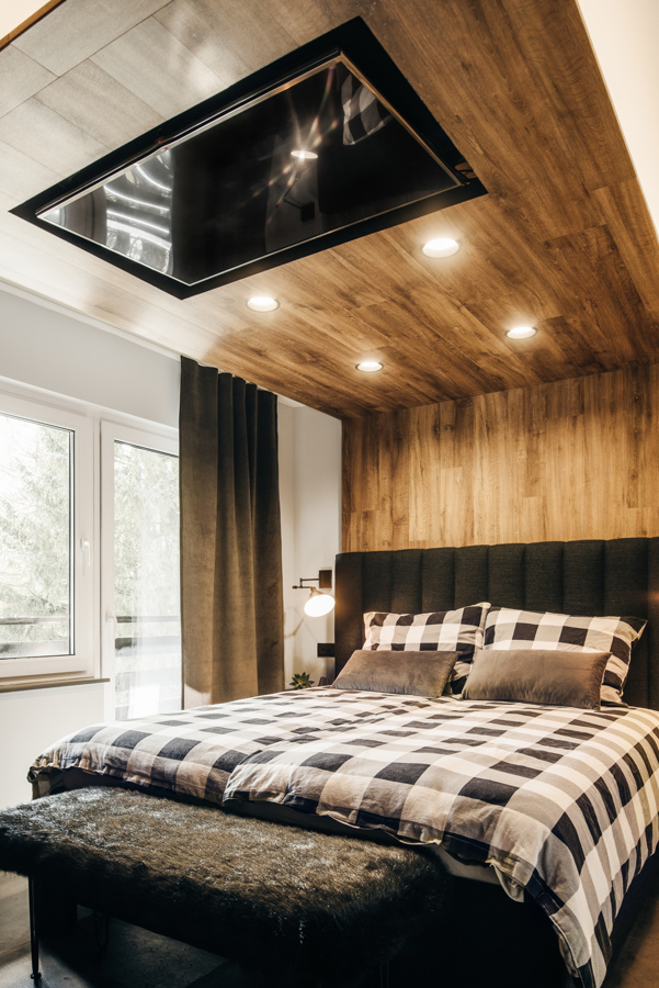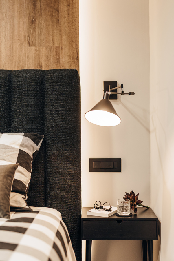 V spalnici udobje poudari po meri izdelana postelja z bogatim oblazinjenim vzglavjem ter mehke zatemnitneve zavese, pridih industrijskega sloga pa dodajo nočne omarice in stenske svetilke,