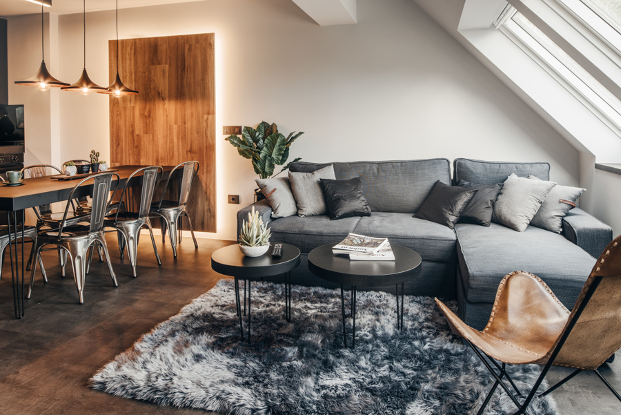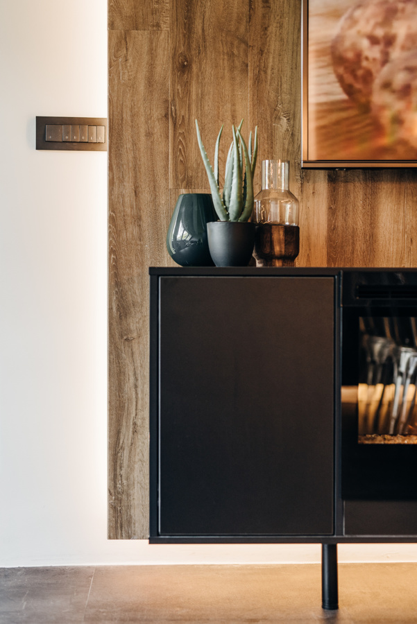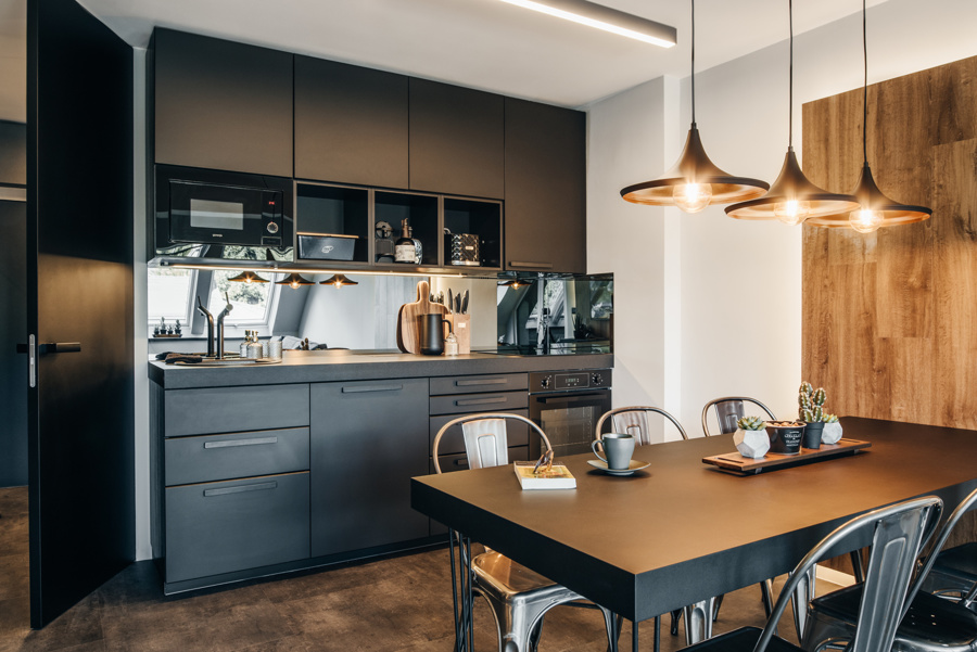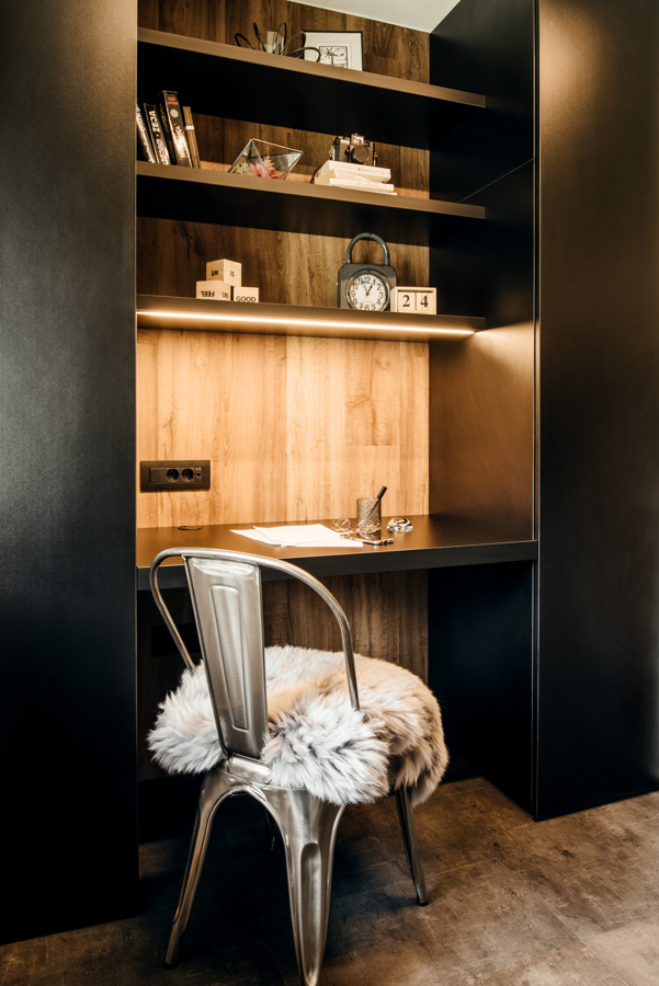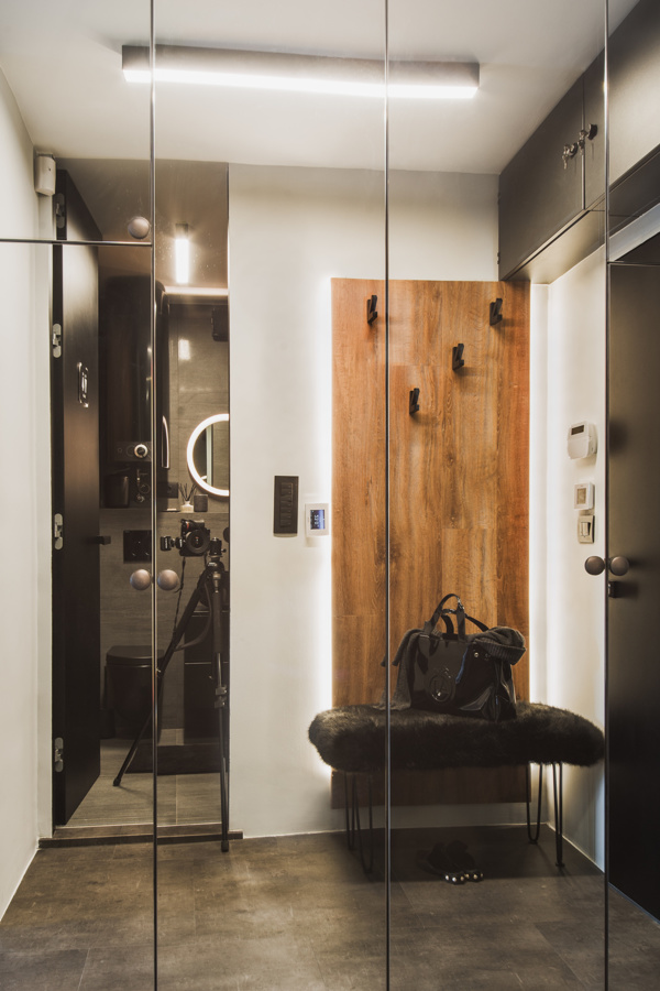 Želje lastnikov stanovanje so bile precej ambiciozne, saj so stremeli k stanovanju, ki bo služilo kot počitniški apartma. Lastniki so si estetsko zaželeli modno stanovanje v temnih tonih s poudarjenimi testurami in industrijskimi detajli. Majhnost prostorov so optično povečali tudi s pomočjo ogledal, ki jih je mogoče opaziti v vlogi front omar in kuhinjskega ozadja.