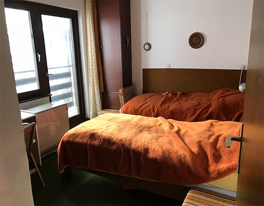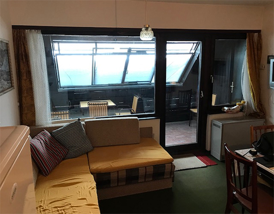 Dnevna soba je urejena preprosto in udobno, velik kavč lahko služi tudi kot dodatno ležišče, ostalo pohištvo je manjših dimenzij in premično. Dnevna soba se odpre na večji balkon, ki ponuja lep razled na bližnje smreke in gore.
