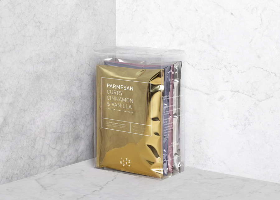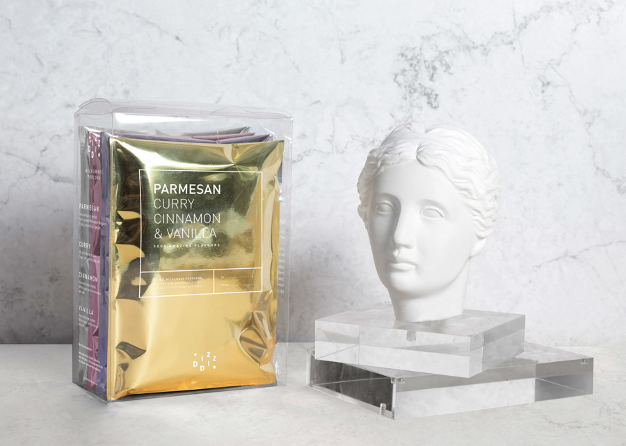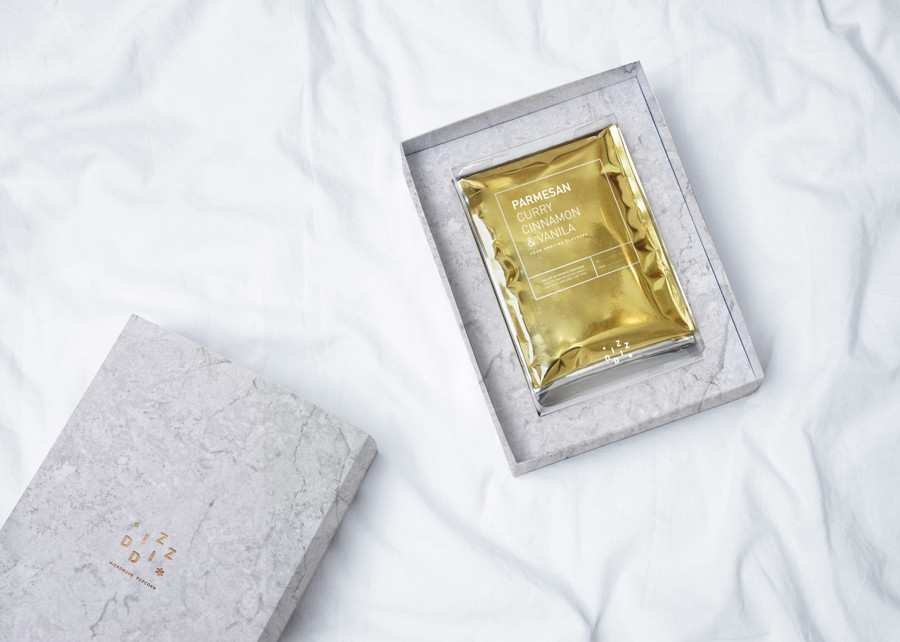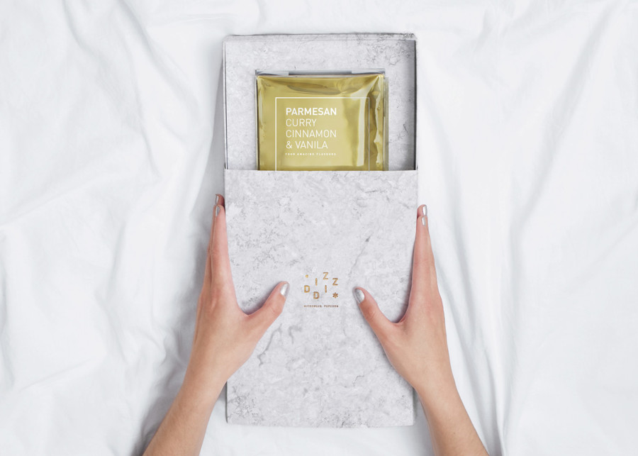 Celotna zgodba se vrti okoli blagovne znamke Diz Diz, ki je priljubljeni prigrizek, za pripravo v mikrovalovni pečici, povzdignil na višjo raven. Zanimivi in nič kaj banalni okusi pokovke, kot so parmezan, curry, cimet in vanilija so sedaj pakirani v luksuzne vrečke, ki spominjajo na marmorne plošče, so v zadnjem času postali pravi hit pri oblikovalcih. Oblikovalski studio Tatabi je navdih za embalažo sicer našel v Stari Grčiji, mitološkemu domu starogrških bogov, kot referenco za barve in estetiko. Vrečke s štirimi različnimi okusi so pakirane v fleksibilno embalažo z enostavnim zapiranjem. Folija v barvi zlata, platine, srebra in v rožnatem odtenku ter estetska embalaža odlično zaokrožijo luksuzno celoto.
