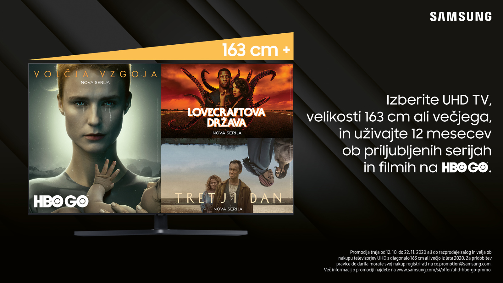 Da bo zabava popolnejša, je Samsung pripravil posebno promocijo - če v obdobju od 12. oktobra do 22. novembra 2020 kupimo Samsung UHD televizor z diagonalo 163 centimetrov (65”) ali večjo, bomo lahko 12 mesecev uživali v najbolj priljubljenih serijah in filmih na HBO GO. To je vse, kar potrebujemo za nepozabno zabavno izkušnjo na novem televizorju, ki bo obogatil naš dom.