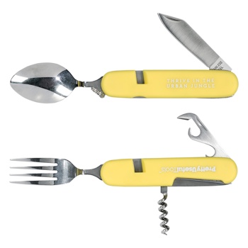 Jedilni pribor Pretty Useful Tools je narejen iz nerjavečega jekla z mehkimi prijemalnimi ročaji in vključuje nož, vilice, žlico, odpirač za steklenice in spiralo. Idealno za piknike.