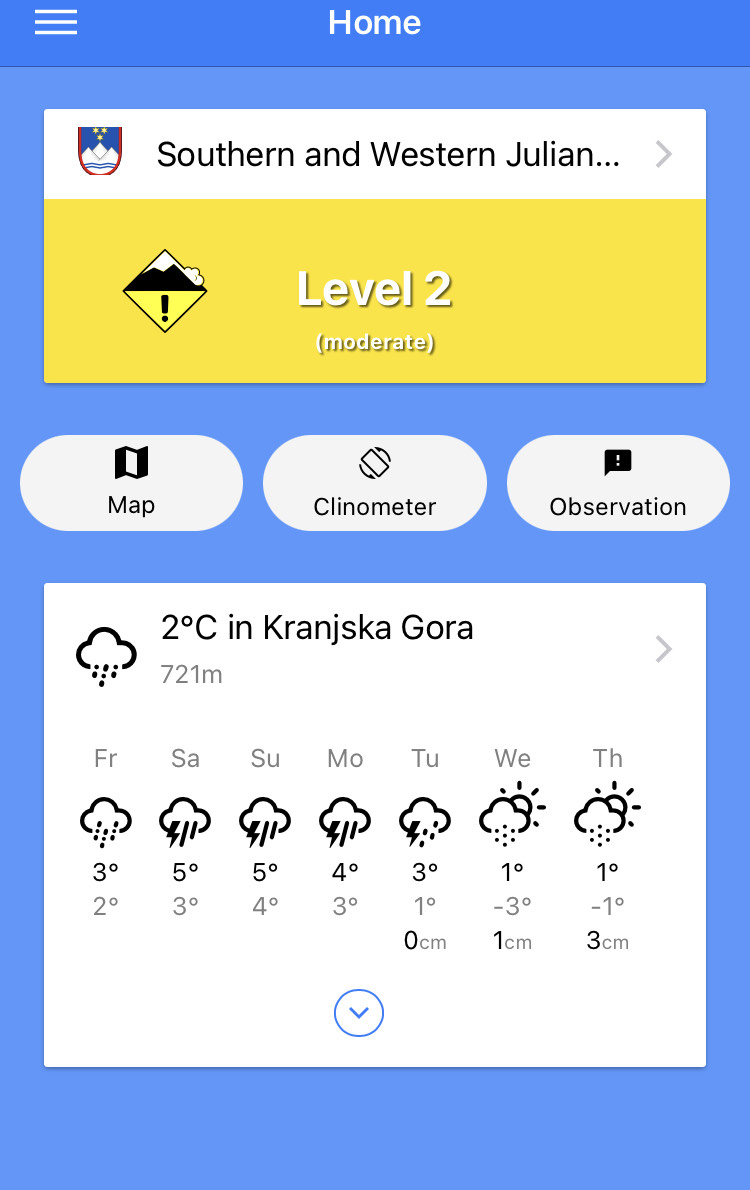 To je aplikacija za turne smučarje, deskarje in vse tiste, ki se odpravljamo v zasnežene gore. Uporabnikom pomaga pri določanju plazovne nevarnosti, meri naklon pobočij, na voljo pa je tudi natančna vremenska napoved. Informacije za Julijske, Kamniško-Savinjske Alpe in Karavanke so na voljo navkljub morebitni slabi pokritosti z omrežjem in internetom.