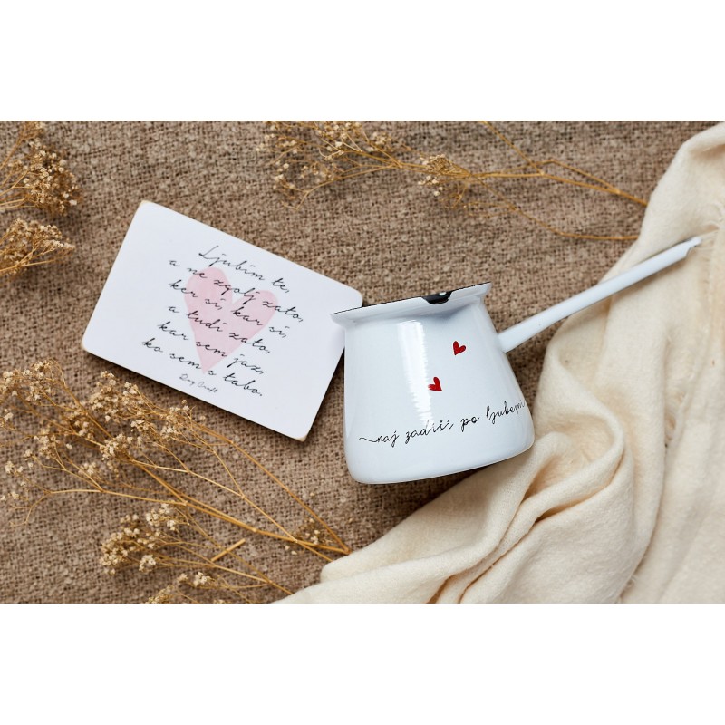 Darilni set, ki vsebuje emajlirano džezvo znamke Cuckoo Cups in leseno deščico ljubezen, bo kot nalašč darilo za vse ljubitelje dobre kave. Napis Naj zadiši po ljubezni pa bo vašo ljubljeno osebo že takoj zjutraj spomnil, kdo ji je kupil to čudovito darilo. Lahko pa jo na valentinovo tudi presentite z zajtrkom v postelji in dišečo kavo, ki jo postrežete v džezvi.