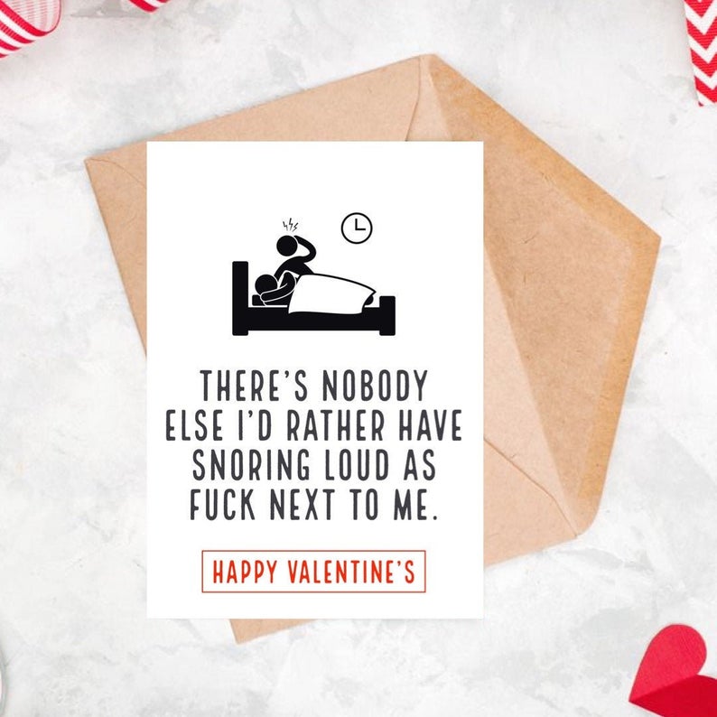 Če noben od vaju ni pretirano navdušen nad praznovanjem valentinovega in bi podaril samo majhno, a zabavno pozornost, bodo kartice z zabavnimi napisi več kot primerne. Ena takšnih je tudi ta z napisom: There's Nobody Else I'd Rather Have Snoring Loud As F*ck Next To me (Nikogar drugega ne bi imel raje kot tebe, ko smrčiš na glas poleg mene). Takšno kartico lahko brez težav izdelate tudi sami doma.