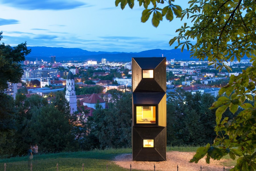 Bivalna enota je samozadostna in lahko služi različnim funkcijam. Tokrat je v njej urejena knjižnica v treh etažah. V vsaki so zbrane knjige različnih tematik, ob branju katerih lahko uživamo v razgledu na prestolnico. V arhitekturnem biroju so poudarili, da projekt promovira tradicionalno slovensko lesarstvo in mizarstvo.