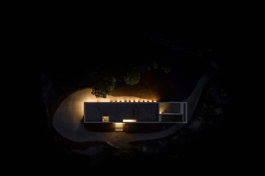 Okna, ki segajo od tal do stropa so obrnjena proti vzhodu in osvetlijo celotno hišo ter v glavni dnevni sobi prikazujejo čudovite razglede na pokrajino. Na strehi je tudi odprta terasa, ki ima previsni bazen, celoten prostor pa je narejen tako, da vpija svetlobo, ob enem pa dvignjena oblika spodaj omogoča prostor za parkiranje.