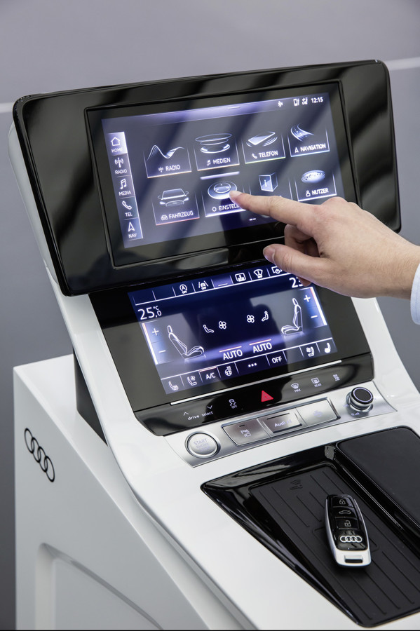 Arhitektura notranjosti se spaja z Audijevim novim konceptom upravljanja MMI touch response. Ta je z velikima, visokoločljivostnima zaslonoma na dotik nadomestil vrtljivo-pritisni regulator ter običajne tipke in regulatorje predhodnega modela. Voznik na zgornjem zaslonu upravlja multimedijski sistem. 8,6-palčni spodnji zaslon, nameščen na asimetrično oblikovani konzoli sredinskega tunela, omogoča upravljanje klimatske naprave in komfortnih funkcij ter vnos besedila. Pri tem lahko zapestje počiva na široki izbirni ročici avtomatskega menjalnika.Vozilo lahko opcijsko opremijo s projekcijskim sistemom zaslona, ki pomembne informacije projicira na vetrobransko steklo. Poleg MMI navigacije plus je avto opremljen tudi z Audijevim virtualnim prikazovalnikom z 12,3-palčnim zaslonom.