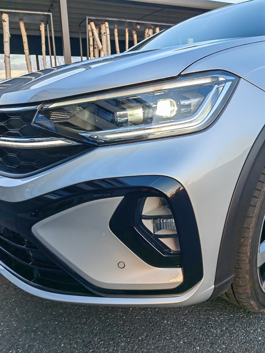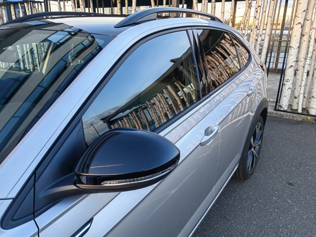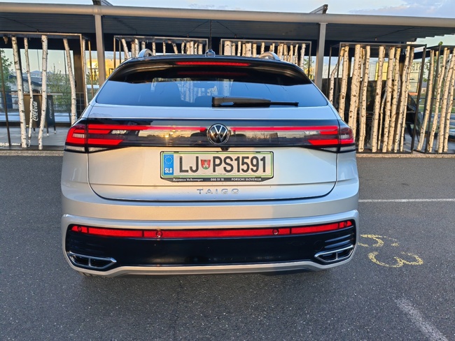 Novi Volkswagnov adut med tako imenovanimi mini športnimi terenci že na prvi pogled izkazuje sorodstvo s starejšima bratoma VW T-Cross in T-Roc, a so snovalci želeli iti še korak dlje, zaradi česar so v oblikovanju še bolj poudarili športno in kupejevsko obliko. To jim je tudi uspelo, saj je novi VW Taigo kljub videzu malenkost daljši od obeh omenjenih, predvsem pa je naš testni avto, opremljen z dinamičnim paketom R-line ponujal povsem športni videz. Črna streha, ogledala v črni barvi in črne linije na odbijačih še poudarijo športnost. Prav tako smo opremo R-Line opazili v notranjosti vozila z majhnimi detajli, predvsem pa v obliki udobnih športnih sedežev spredaj in zadaj.
