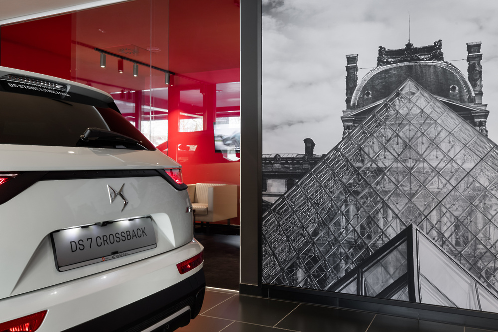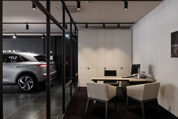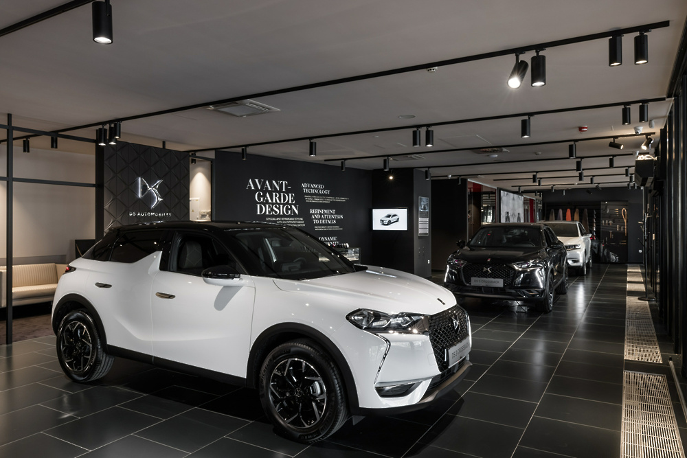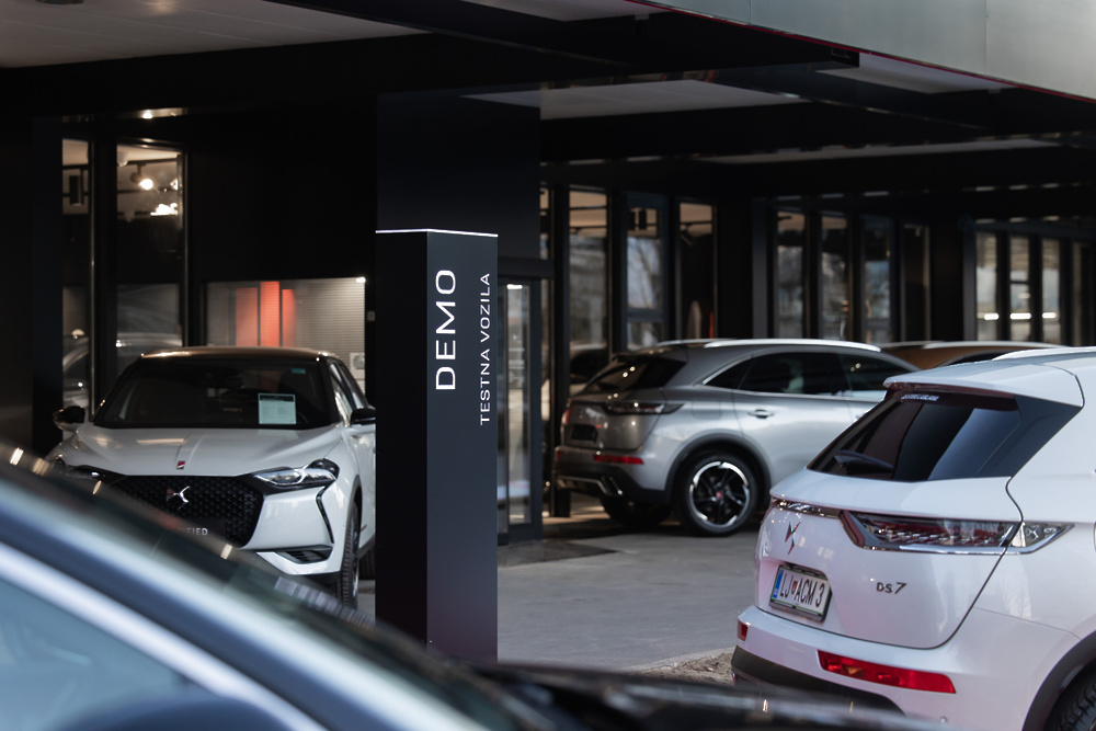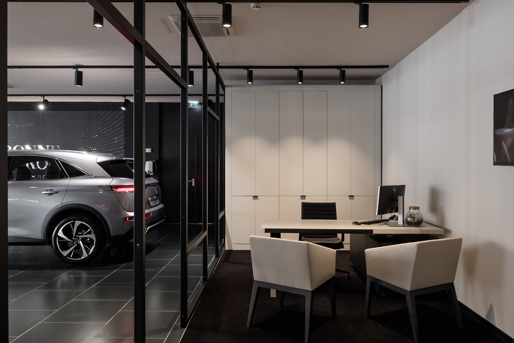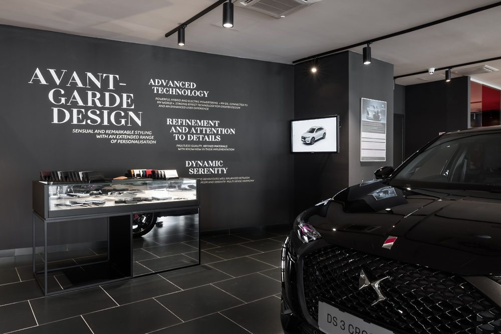 - RAZSTAVNI PROSTOR VOZIL: kjer stranka v miru in ob pomoči DS prodajnega svetovalca spozna vozilo preko statične predstavitve. Sočasno si lahko preko velikega zaslona na dotik v konfiguratorju sestavi svoje sanjsko vozilo ali si ogleda ponudbo modnih in ostalih dodatkov iz DS Boutique-a.