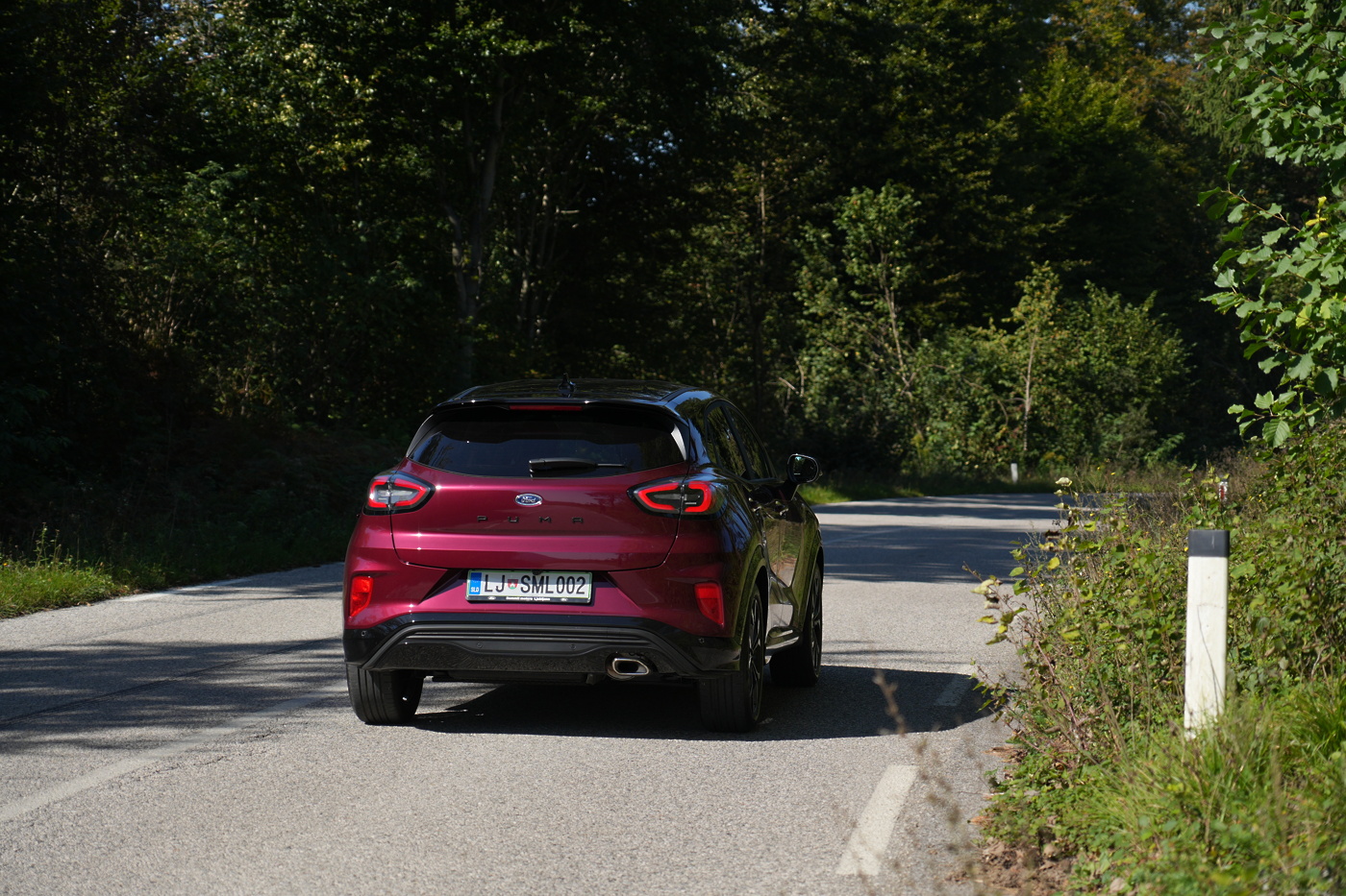 Posebna serija male Pume z bogato opremo in atraktivnim izgledom privablja kupce. In to ji odlično uspeva, saj je že na prvi pogled res simpatična, znotraj pa bogato založena zmore pričarati zelo prijetno vzdušje. Sedeži in volanski obroč so namreč v tem primeru odeti v usnje, sprednja sedeža pa lahko posebej pohvalimo še zaradi malce bolj izdatnega bočnega oprijema, zaradi katerega nista nič manj udobna. Obenem v zavojih znata ponuditi nekaj več hrbtnega objemanja in potnikoma zagotoviti udobje tudi ob hitrejši vožnji. Glede položaja za volanom pri Fordih ni nikoli težav in tudi tukaj se sedi odlično, volan lepo sede v roke, malce utesnjen občutek za volanom pa pomeni, da deluje navihano že na mestu. Med vožnjo je treba takoj pohvaliti lahkotnost – kljub malenkost bolj čvrsto nastavljenemu podvozju Puma namreč nikoli ni naporna ali neudobna. Litrski trivaljni turbobencinski motor je pri Fordu res že stari znanec, a ga še vedno lahko pohvalimo. V tem primeru različice Vivid Ruby Edition gre za močnejšo izvedenko s 114 kW moči, kar je 155 konjev. Ker je Puma relativno majhna, to pomeni, da pospešuje precej odločno in motorju sape zlepa ne zmanjka. 8,7 sekunde potrebuje do stotice, v kombinaciji z odličnim podvozjem pa to pomeni, da se bomo z veseljem zapodili med ovinke. Po značaju je Puma navihana in dinamična, zato je polovica uredništva menila, da bi takšno izbrala raje z ročnim menjalnikom, ki bi voznika še bolj vpletel v vožnjo. Druga polovica pa je zagovarjala takšen robotizirani sedemstopenjski menjalnik, ki s samodejnim sprehajanjem med prestavami skrbi, da se vozniku s tem ni treba ukvarjati. Samodejni menjalnik lahko pohvalimo – je prijeten in med vožnjo dovolj hiter.