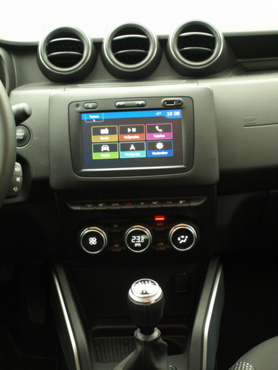 Tipke za upravljanje posameznih funkcij so nameščene nad upravljalnikom klimatske naprave in sicer v piano razporeditvi. Tam se poleg ostalih tipk nahajata tipki za nadzor vozila ob spusti HDC in stikalo za vklop kar štirih kamer (dve sta nameščeni na vzvratnih zunanjih ogledalih in ena spredaj ter druga zadaj). Sistem HDC avtomatsko zavira vozilo ob spustu in s tem omogoča natančnejše in lažje krmiljenje. Za ljubitelje terenske vožnje sta na zaslonu s podatki za terensko vožnjo prikazana tudi kompas in trenuten kot nagiba avtomobila. Prvič je pri Daciji na voljo tudi zagon motorja brez ključa in pametna kartica za odklepanje in zaklepanje vozila. Nova osrednja konzola zaradi zamaknjene ročice ročne zavore ponuja več prostora in idealno umeščen gumb za izbiranje načina pogona.