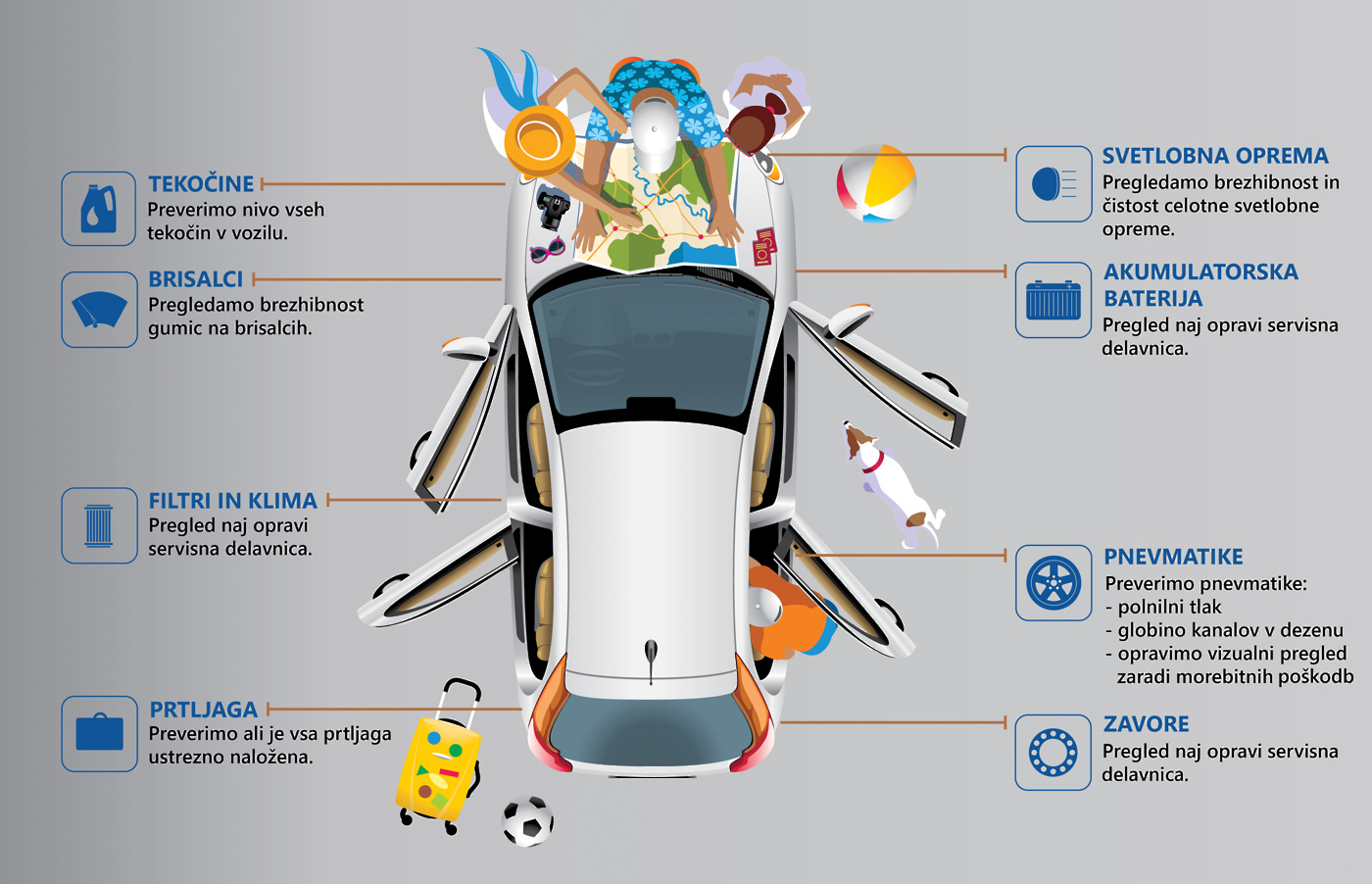 Pot dobro organizirajte in načrtujete, preverite delovanje vašega vozila. Prtljaga naj bo v vozilo zložena pravilno in varno pritrjena; zagotovite dobro preglednost skozi vsa okna in ogledala. Ker bo vozilo zaradi prtljage dodatno obteženo, pred odhodom preverite ustreznost tlaka v pnevmatikah. Poskrbite za zadostne količine vode za vse potnike v vozilu. Preverite pravilno in dosledno pripetost vseh potnikov in uporabo otroških zadrževalnih sistemov.