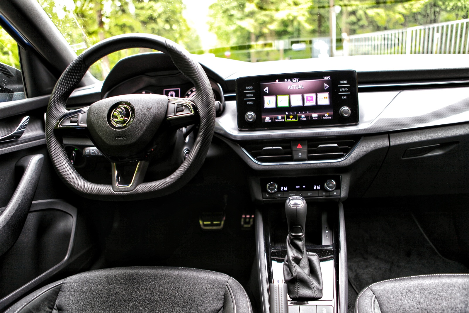 Nova zasnova notranjosti Škode Scale (njena prostornina je skoraj enaka prostornini modela Octavija prve generacije) se poleg ergonomije lahko pohvali s prostornostjo, številnimi odlagalnimi mesti in prtljažnikom s prostornino 467 litrov, s čimer je ta največji v tem segmentu. V primeru, da sedeže deljive zadnje klopi poklopite (60/40) prostornina prtljažnika naraste na 1.410 litrov. Večja medosna razdalja omogoča udobno sedenje na zadnjih sedežih, tudi prostora za glavo zadaj je dovolj. Povsem na novo je zasnovana tudi armaturna plošča, na kateri se lahko bohoti prostostoječi zaslon do velikosti do 9,2 palca. Armatura sledi liniji pokrova motornega prostora, obenem pa pod pod zaslonom ustvarja ergonomsko površino za dlan, s katero voznik upravlja zaslon na dotik. Sprednje vratne obloge imajo mehko površino. Tople barve, individualni dekorativni elementi, ambientna osvetlitev in barvni kontrastni šivi na sedežih z opcijskim oblazinjenjem iz žlahtnih mikrovlaken Suedia ustvarjajo prijetno atmosfero. Za dodatno udobje po želji poskrbita ogrevano vetrobransko steklo in ogrevan volan.