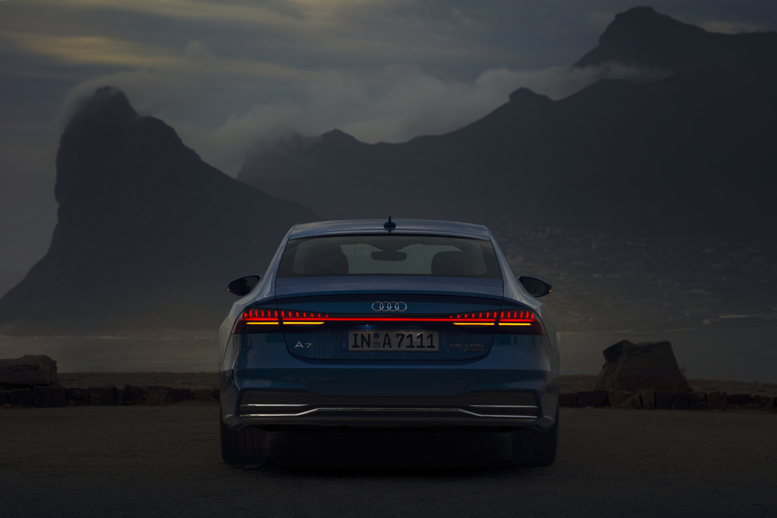 Zunanji dizajn novega Audija A7 Sportback na impresiven način pooseblja Audijev novi, napredni oblikovalski slog, katerega posebnost so velike površine, ostri robovi ter igra svetlobe in senc. Široka, nizko nameščena mreža hladilnika z enodelnim okvirom jasno odraža dinamični značaj gran turisma. Obe opcijski izvedbi žarometov imata dvanajst ločenih, pokončno nameščenih svetlečih segmentov in vzbujata pozornost s svojstveno svetlobno signaturo. Kot najbolj izpopolnjena različica so na voljo HD matrični LED-žarometi z Audijevimi laserskimi lučmi, ki jih je mogoče prepoznati po modri diodi v reflektorju. Silhueto vozila še posebej močno zaznamuje strešna linija, ki se drzno spušča proti zadku. Veliki kupe meri v dolžino 4,97 m, v širino 1,91 m, v višino pa le 1,42 m.