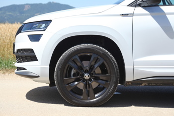Škoda Karoq Sportline se od "običajnih" različic loči s kar nekaj elementi. In sicer z 18-palčnimi aluminijastimi platišči, dekorativnimi elementi v črni barvi, kot tudi strešnimi nosilci in črnimi vzvratnimi ogledali ter ob B stebrička dalje zatemnjenimi stekli. Deluje vpadljivo, vendar še vedno ravno prav zadržano.