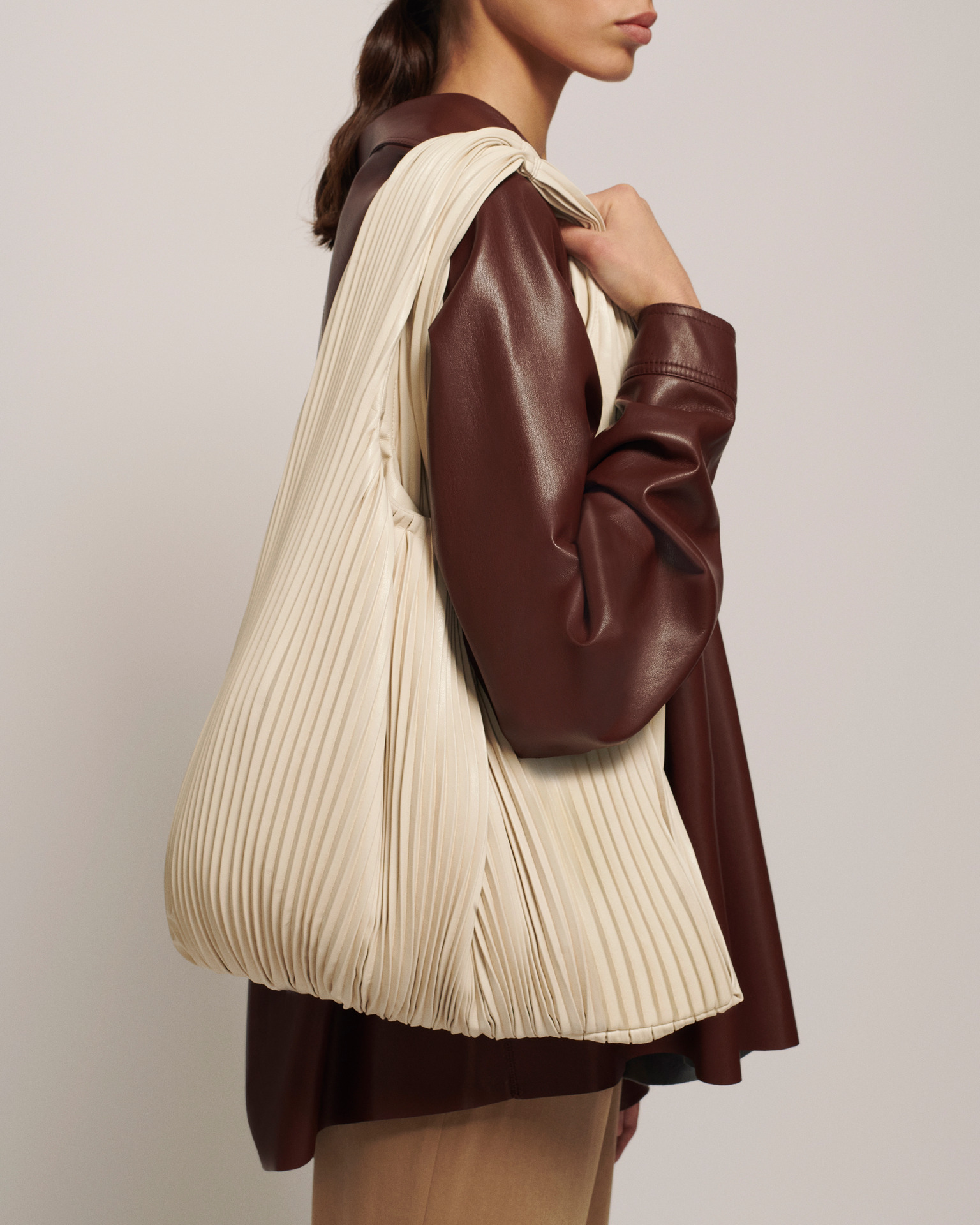 Urbana modna znamka iz Budimpešte navdušuje modni svet z etičnimi torbicami iz veganskega usnja. Za leto 2021 ponuja udobne modele v colour-blocking kombinacijah, kot sta na primer krem in vinsko rdeča. Nadvse popularni so tudi manjši modeli za v roko, ki imajo simpatičen videz zavezane vrečke za smeti. #fauxleather #fashion #vegan #crueltyfree