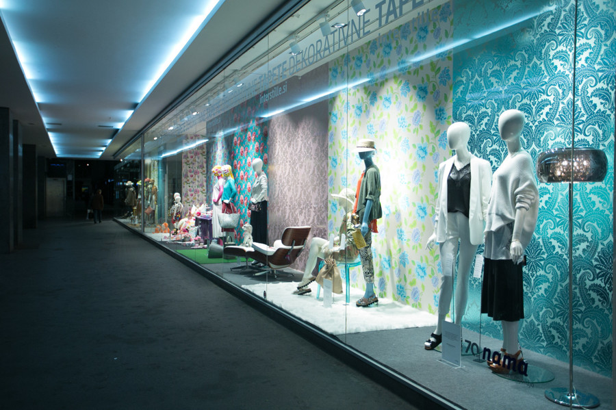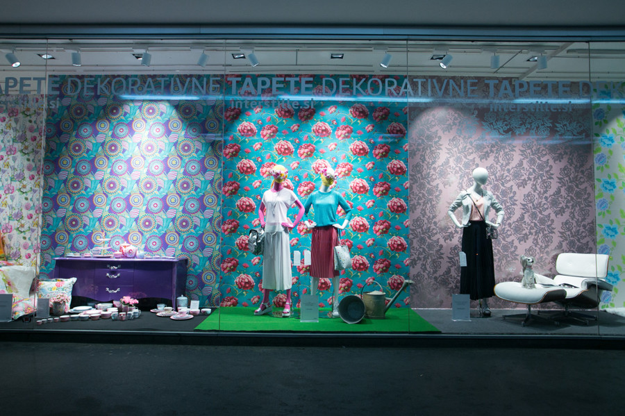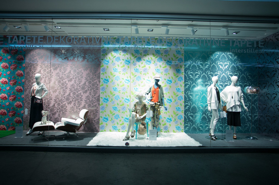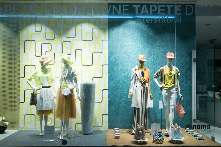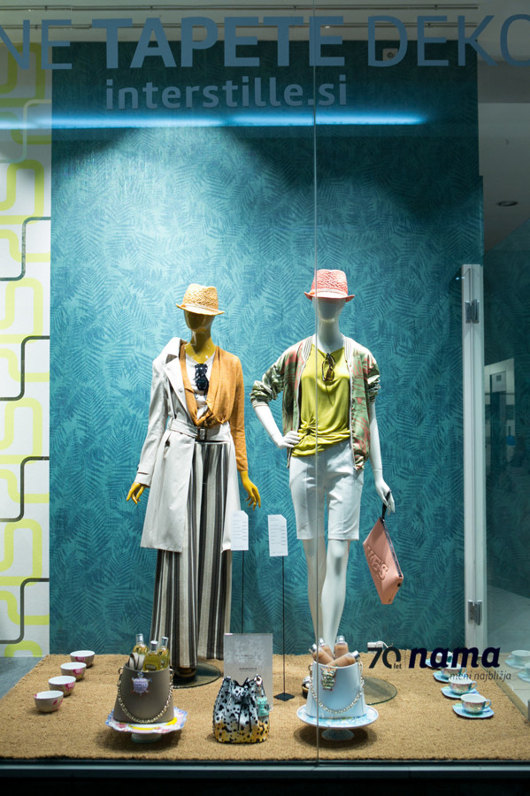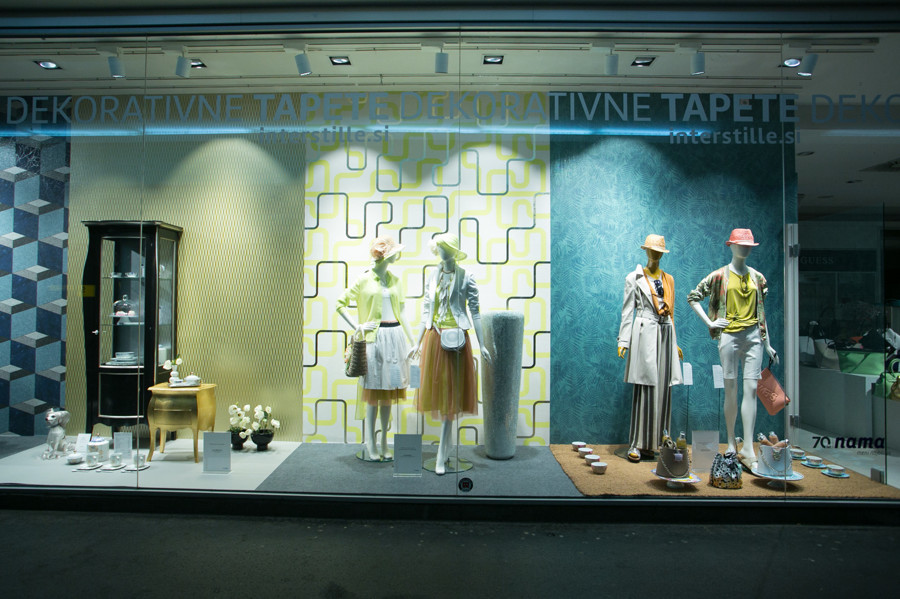 Ljubljanska veleblagovnica je k oblikovanju svojih izložb skupaj s hišno vodjo aranžiranja Aljo Dermastja prvič povabila kar devet modnih strokovnjakov. Iz oblačil in dodatkov globalnih ter domačih blagovnih znamk so ustvarili vsak svojo modno zgodbo. Družbo jim delajo lepo oblikovani izdelki, stajlingi pa med seboj ločujejo sodobne dekorativne tapete Interstille, ki rišejo zanimive kulise in popestrijo vsak prostor.