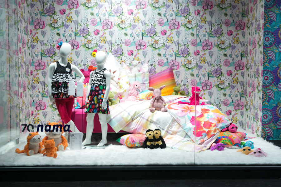 Zaradi dveh privilegijev – lokacije, ki je zagotovo ena najlepših v Ljubljani, in dolgoletne tradicije – je veleblagovnica Nama svoje izložbe vedno razumela kot odlično priložnost za povabilo na lepše. Tako se za steklenimi površinami vedno dogaja kaj zanimivega. Bili so že Lipicanci in Opera, stalo je češnjevo drevo, visele so kopalke, za tradicionalne gospodinjske dneve pa so bile glavne zvezde lepe in praktične stvari za dom. So pa izložbe tudi znanilke novih sezon in svežih modnih trendov, ki bodo kmalu zaživeli na ulicah.