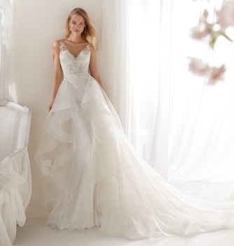 So nazaj bi lahko rekli. Stopničasto krojeni sloji z robovi, ki so še dodatno ojačani, kar nevesti med hojo omogoča prijetno valovanje krila. Takšne obleke so izjemno zanimive in fotogenične. Izredno veliko je stranskih naborkov, kjer najprej vidimo celotno silhueto neveste, nato pa so glavnemu krilu na obe strani dodani še naborki, ki popestrijo celoten izgled.