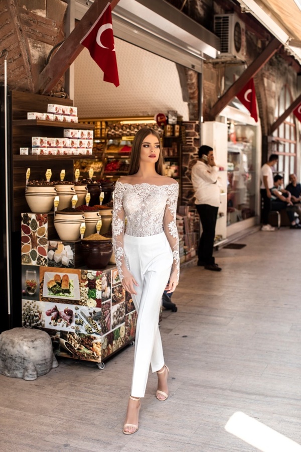 Poročni kombinezoni so postali pravi modni hit in letos ne boste našli kolekcije in oblikovalca, ki ga ne bi krasil vsaj en dizajnerski kos. Kombinezoni ali bele hlače v kombinaciji s čipkastim topom so namenjene samozavestnim nevestam, ki se ne bojijo pokazati svoje postave.